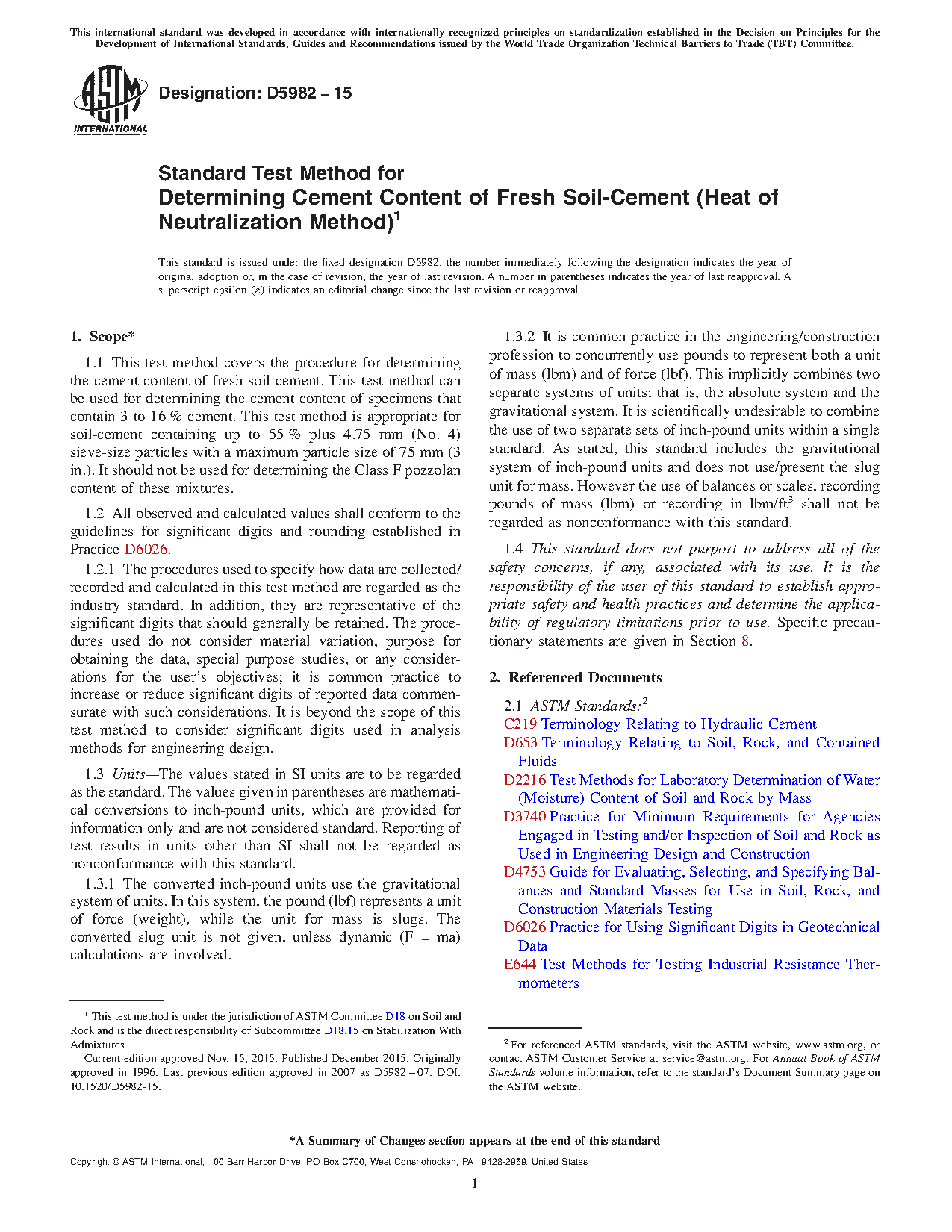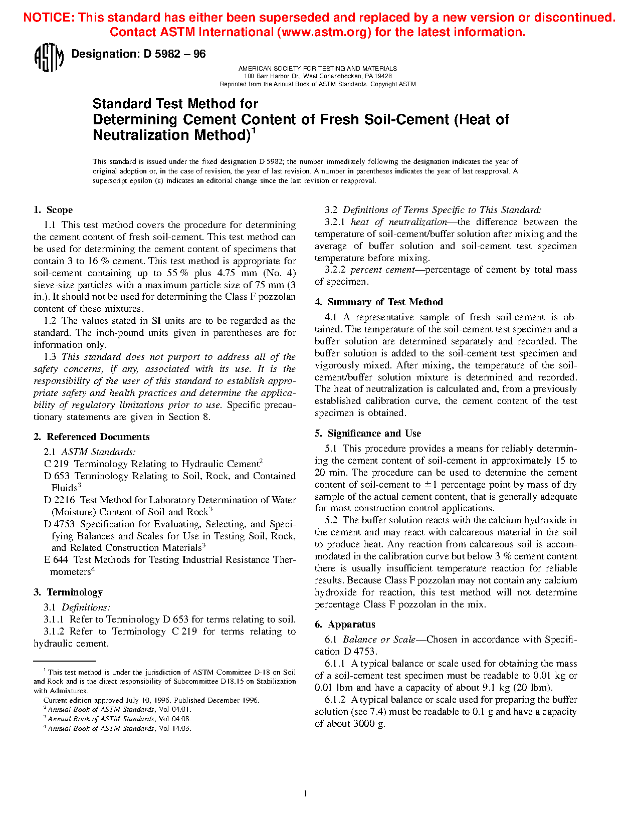 1.1 This test method covers the procedure for determining the cement content of fresh soil-cement. This test method can be used for determining the cement content of specimens that contain 3 to 16 % cement. This test method is appropriate for soil-cement containing up to 55 % plus 4.75 mm (No. 4) sieve-size particles with a maximum particle size of 75 mm (3 in.). It should not be used for determining the Class F pozzolan content of these mixtures.