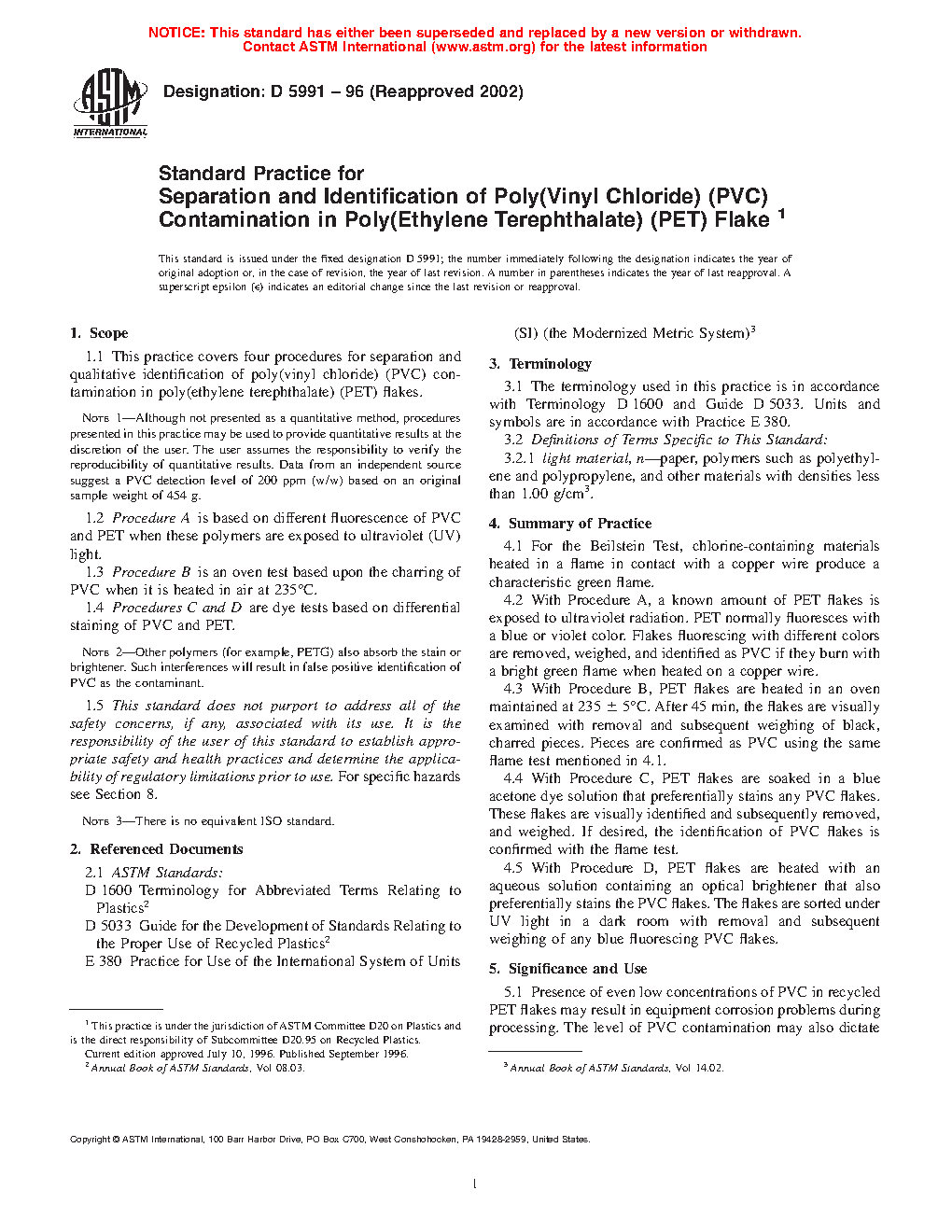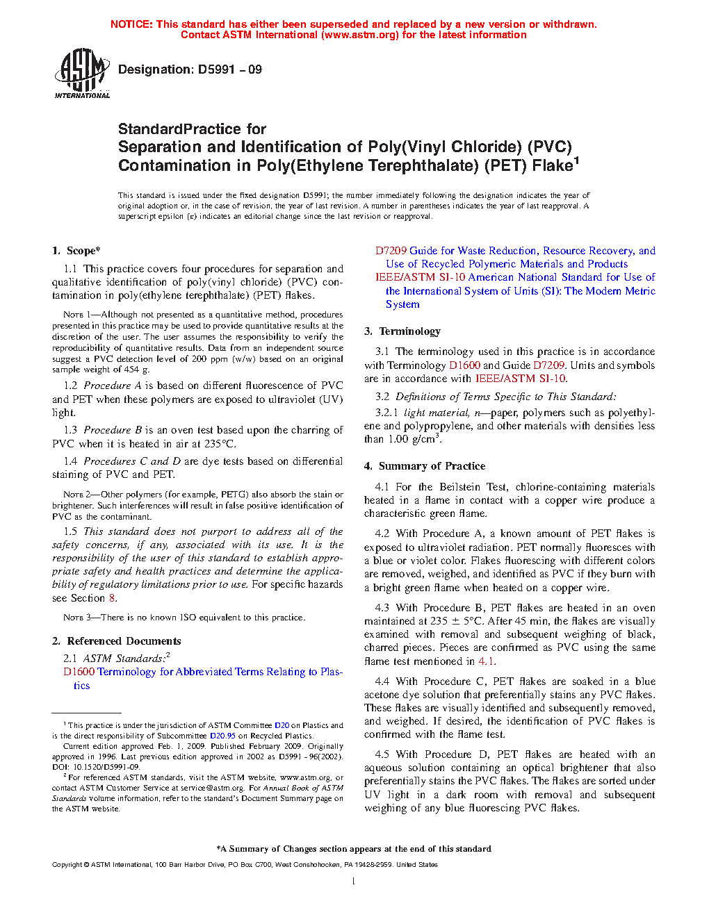 1.1 This practice covers four procedures for separation and qualitative identification of poly(vinyl chloride) (PVC) contamination in poly(ethylene terephthalate) (PET) flakes.