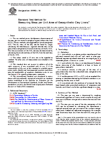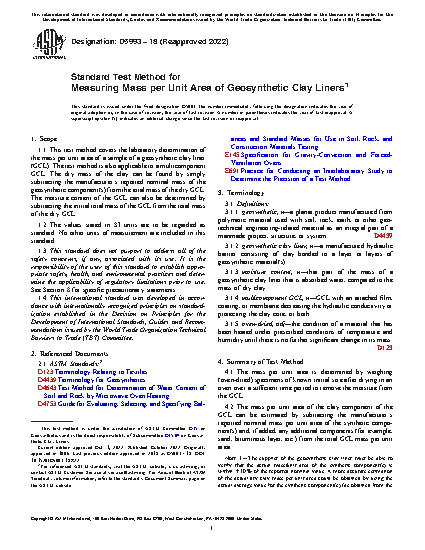 1.1 This test method covers the laboratory determination of the mass per unit area of a sample of a geosynthetic clay liner (GCL). The test method is also applicable to a multicomponent GCL. The dry mass of the clay can be found by simply subtracting the manufacturer's reported nominal mass of the geosynthetic component(s) from the total mass of the dry GCL. The moisture content of the GCL can also be determined by subtracting the initial total mass of the GCL from the total mass of the dry GCL.