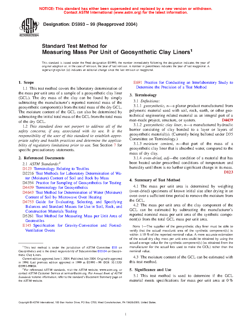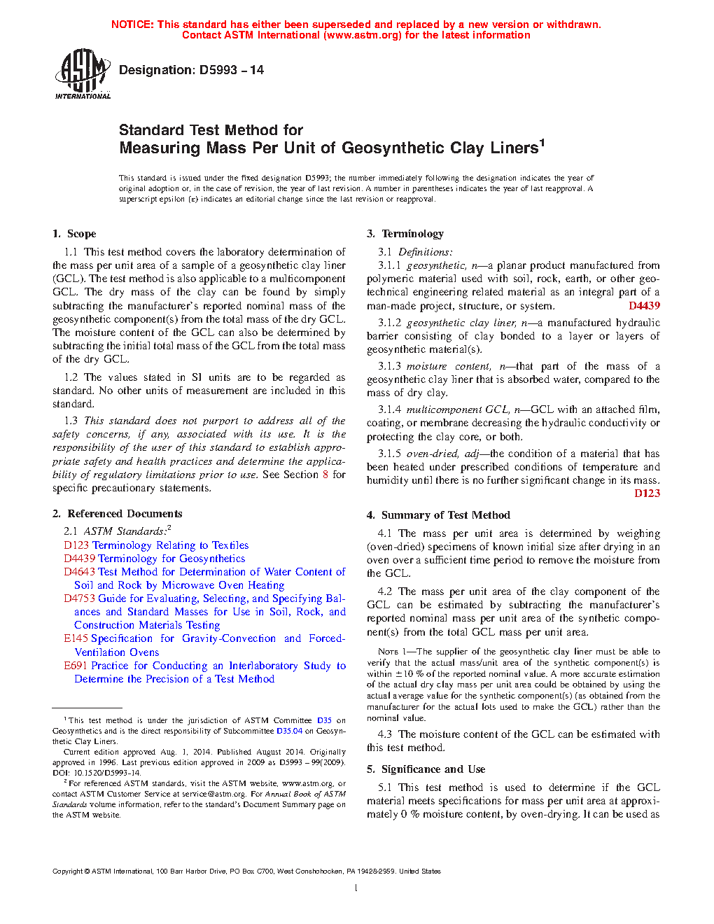 5.1 This test method is used to determine if the GCL material meets specifications for mass per unit area at approximately 0 % moisture content, by oven-drying. It can be used as an index test for quality control or quality assurance to determine specimen conformance.