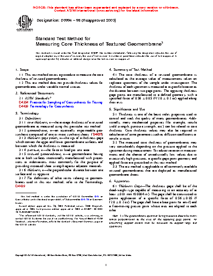 1.1 This test method covers a procedure to measure the core thickness of textured geomembranes.