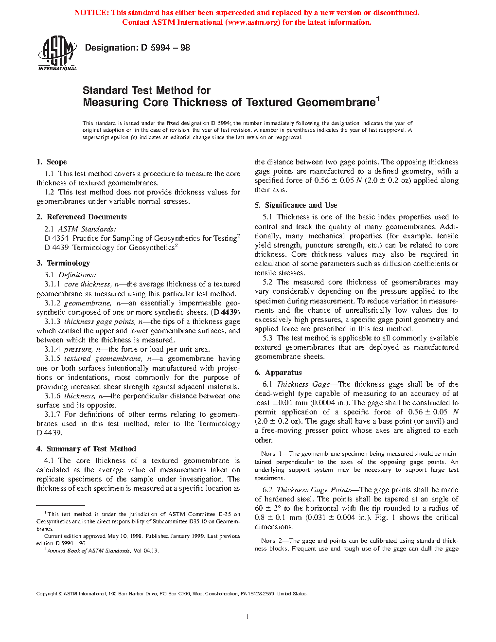 The measured core thickness of geomembranes may vary considerably depending on the pressure applied to the specimen during measurement. To reduce variation in measurements and the chance of unrealistically low values due to excessively high pressures, a specific gauge point geometry and applied force are prescribed in this test method.