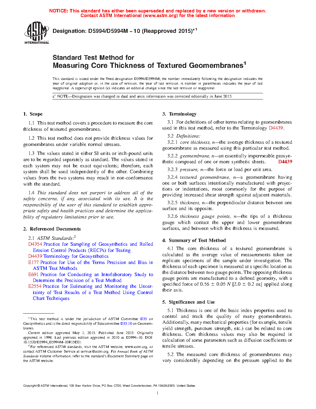 5.2 The measured core thickness of geomembranes may vary considerably depending on the pressure applied to the specimen during measurement. To reduce variation in measurements and the chance of unrealistically low values due to excessively high pressures, a specific gauge point geometry and applied force are prescribed in this test method.