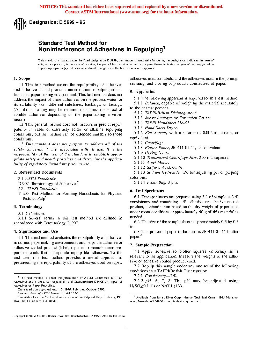 1.1 This test method covers the repulpability of adhesives and adhesive coated products under normal repulping conditions in a papermaking environment. This test method does not address the impact of these adhesives on the process water, or its suitability with different substrates, backings, or facings. (Additional testing may be required to address the effect of soluble adhesives depending on the papermaking environment).