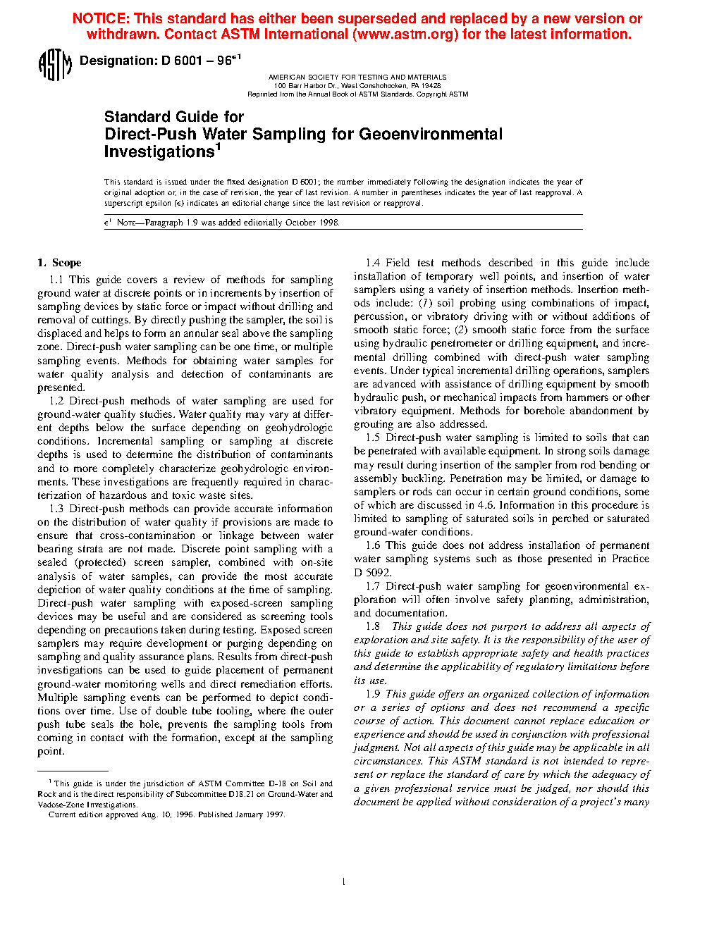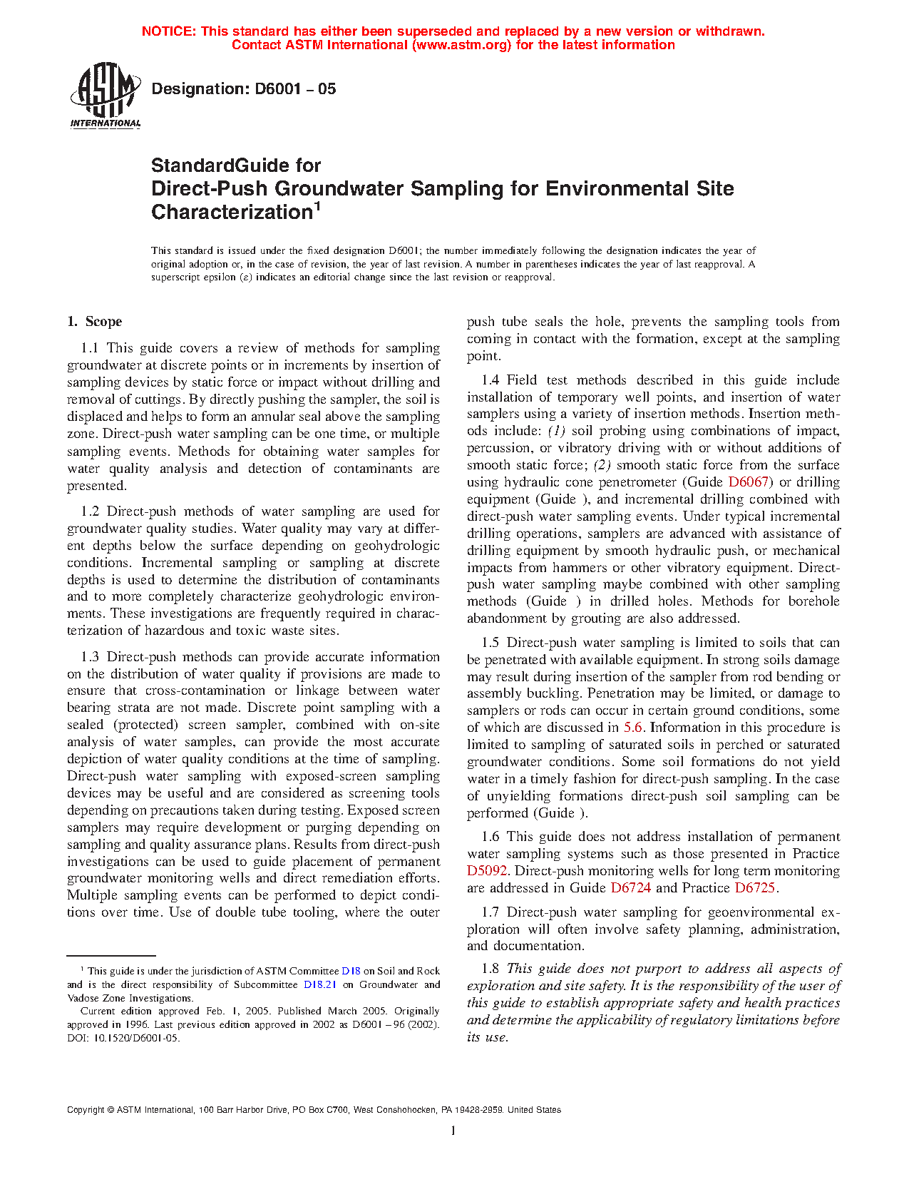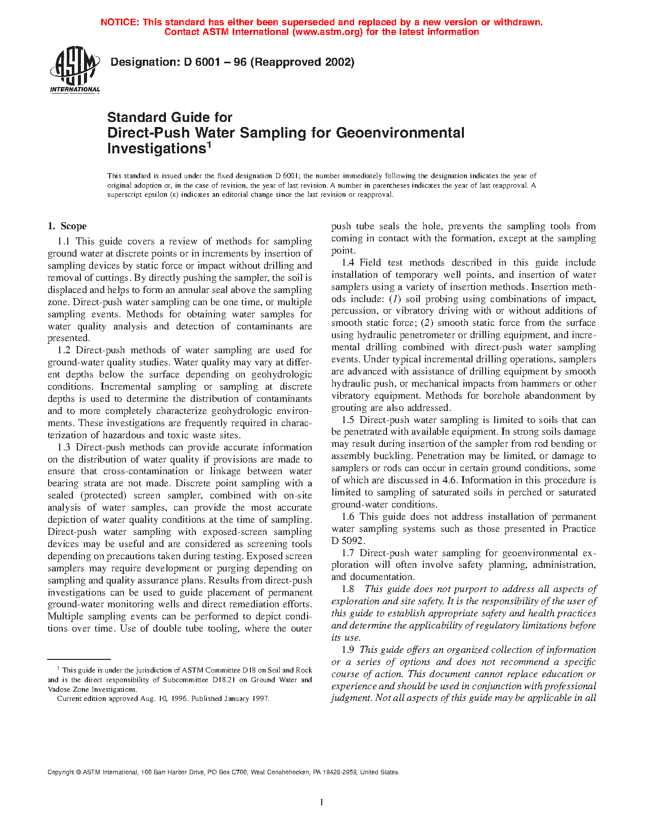 1.7 Direct-push water sampling for geoenvironmental exploration will often involve safety planning, administration, and documentation.