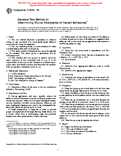 1.1 This test method describes a procedure to measure slump, or sag, resistance of a trowel-grade carpet adhesive using a button slump test apparatus.
