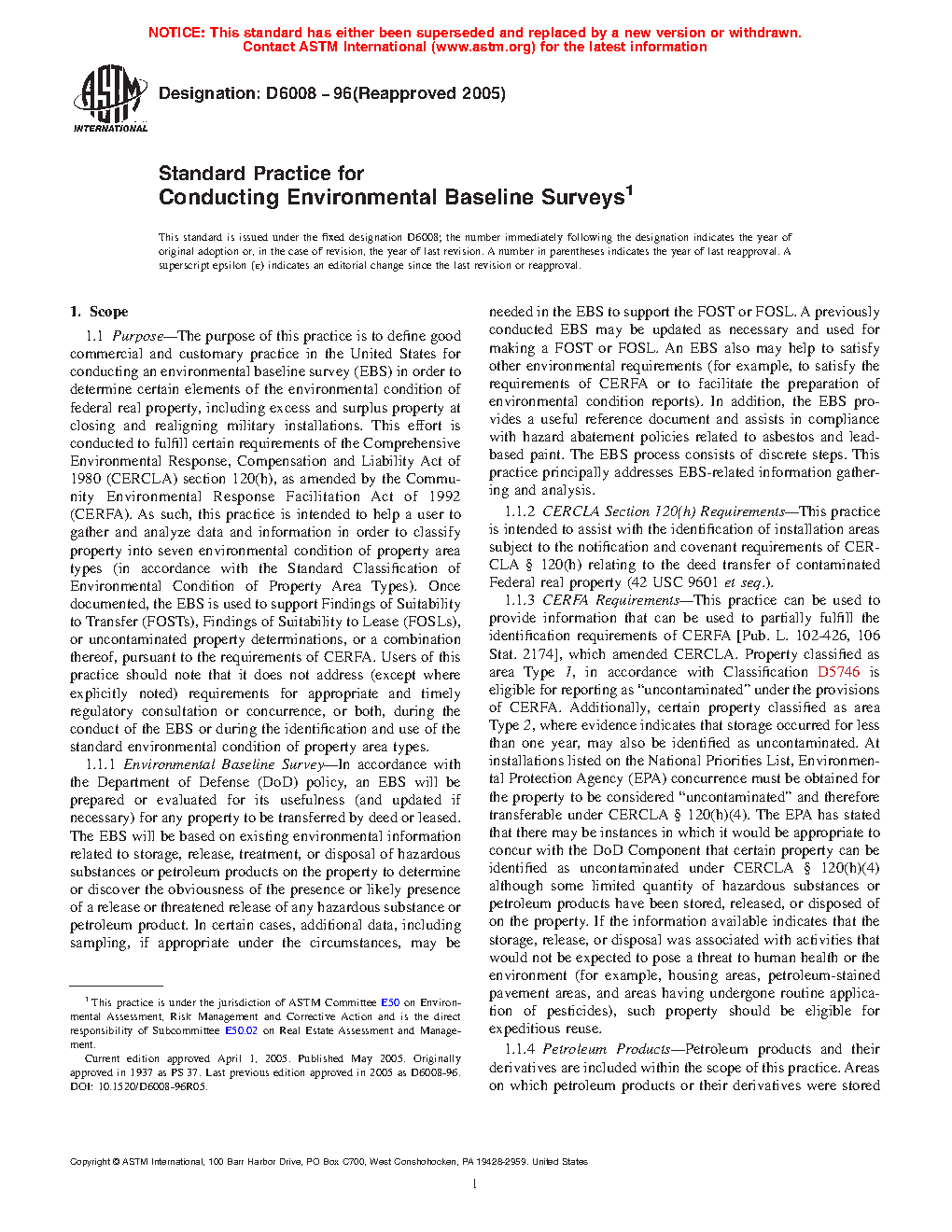 1.1 Purpose—The purpose of this practice is to define good commercial and customary practice in the United States for conducting an environmental baseline survey (EBS) in order to determine certain elements of the environmental condition of federal real property, including excess and surplus property at closing and realigning military installations. This effort is conducted to fulfill certain requirements of the Comprehensive Environmental Response, Compensation and Liability Act of 1980 (CERCLA) section 120(h), as amended by the Community Environmental Response Facilitation Act of 1992 (CERFA). As such, this practice is intended to help a user to gather and analyze data and information in order to classify property into seven environmental condition of property area types (in accordance with the Standard Classification of Environmental Condition of Property Area Types). Once documented, the EBS is used to support Findings of Suitability to Transfer (FOSTs), Findings of Suitability to Lease (FOSLs), or uncontaminated property determinations, or a combination thereof, pursuant to the requirements of CERFA. Users of this practice should note that it does not address (except where explicitly noted) requirements for appropriate and timely regulatory consultation or concurrence, or both, during the conduct of the EBS or during the identification and use of the standard environmental condition of property area types.