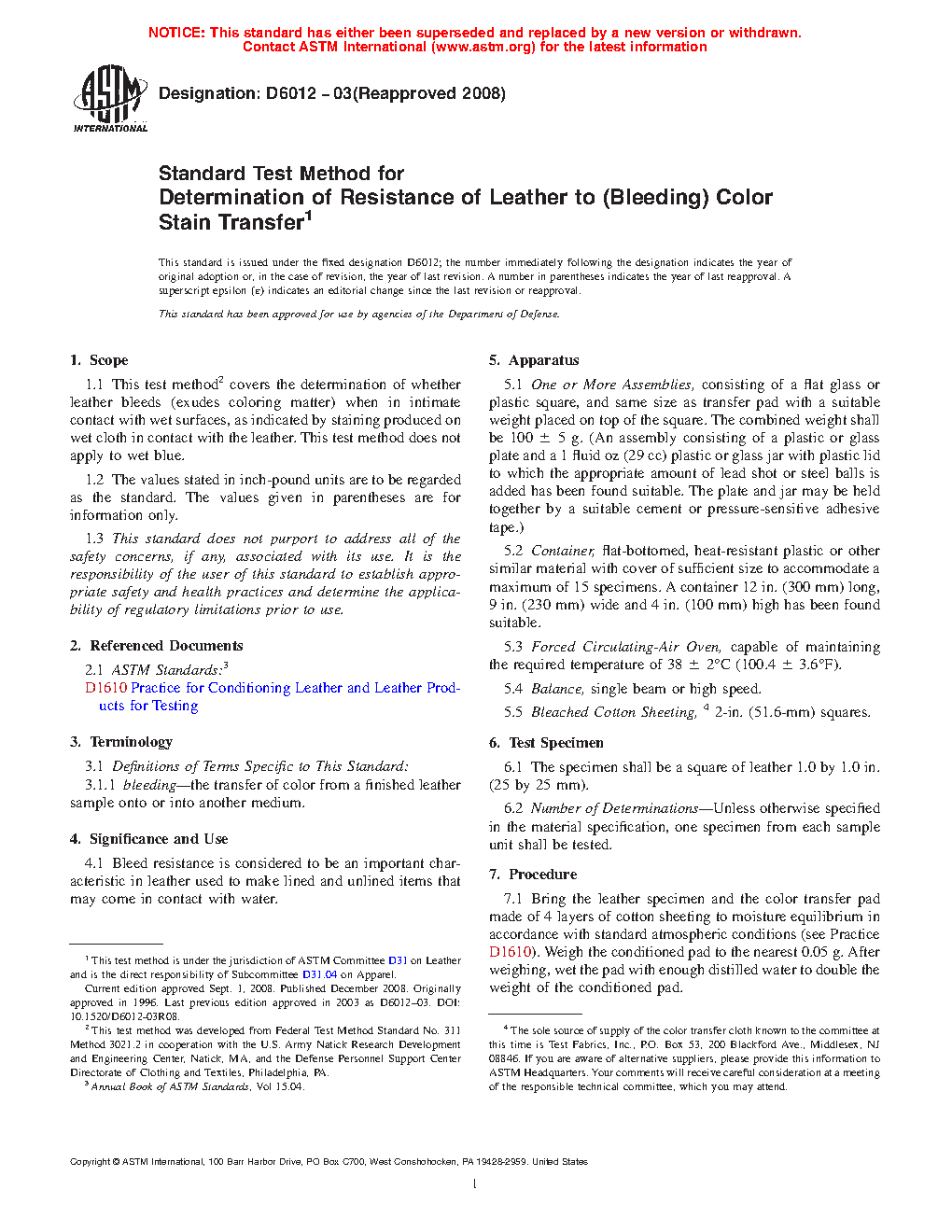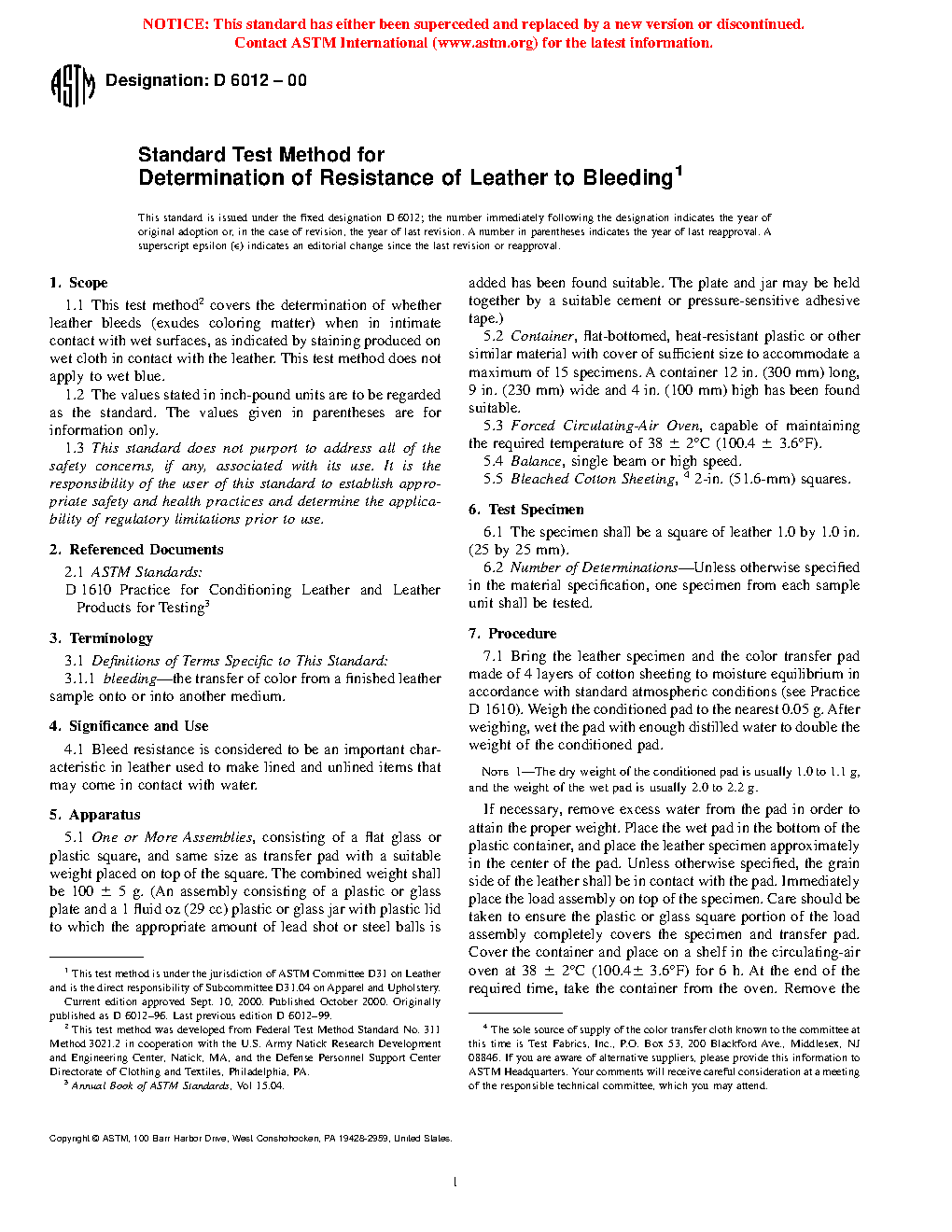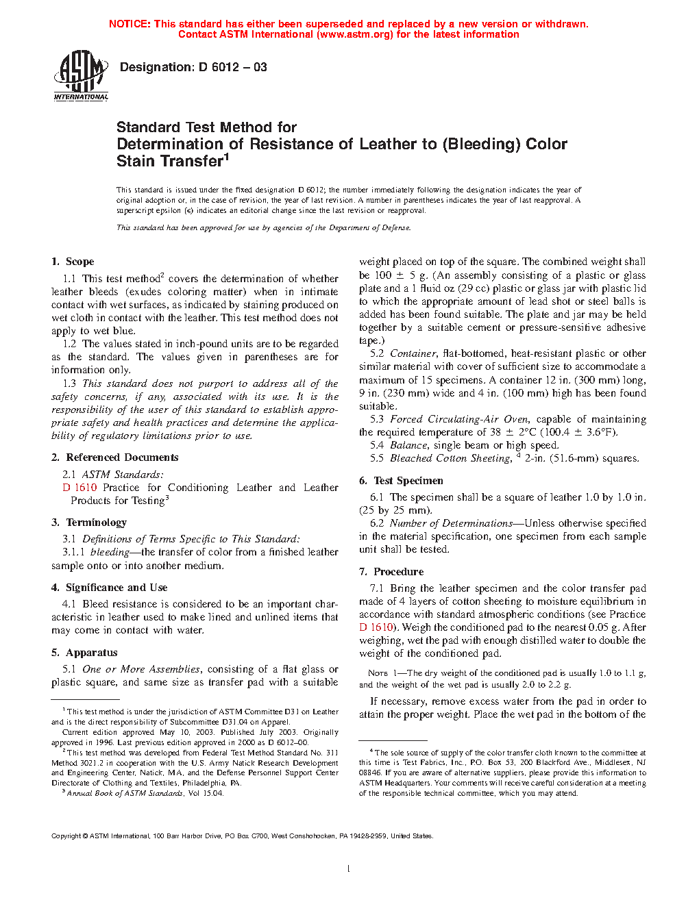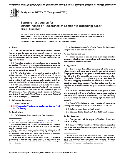 1.1 This test method2 covers the determination of whether leather bleeds (exudes coloring matter) when in intimate contact with wet surfaces, as indicated by staining produced on wet cloth in contact with the leather. This test method does not apply to wet blue.