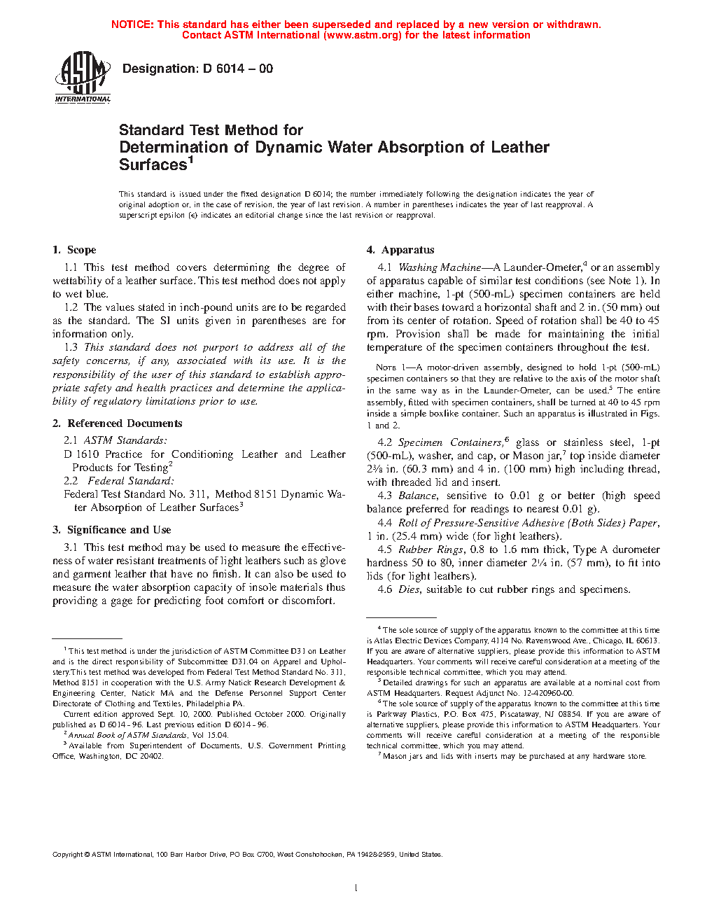 3.1 This test method may be used to measure the effectiveness of water resistant treatments of light leathers such as glove and garment leather that have no finish. It can also be used to measure the water absorption capacity of insole materials thus providing a gauge for predicting foot comfort or discomfort.
