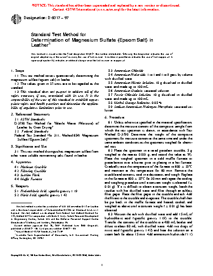 1.1 This test method covers quantitatively determining the magnesium sulfate (epsom salt) in leather.