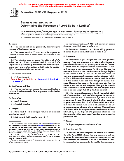 1.1 This test method covers qualitatively determining the presence of lead salts in leather.