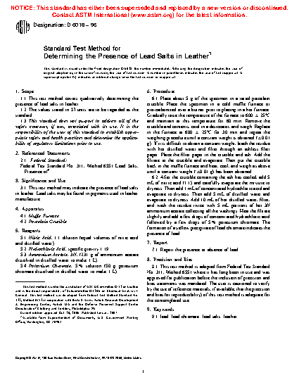 1.1 This test method covers qualitatively determining the presence of lead salts in leather.