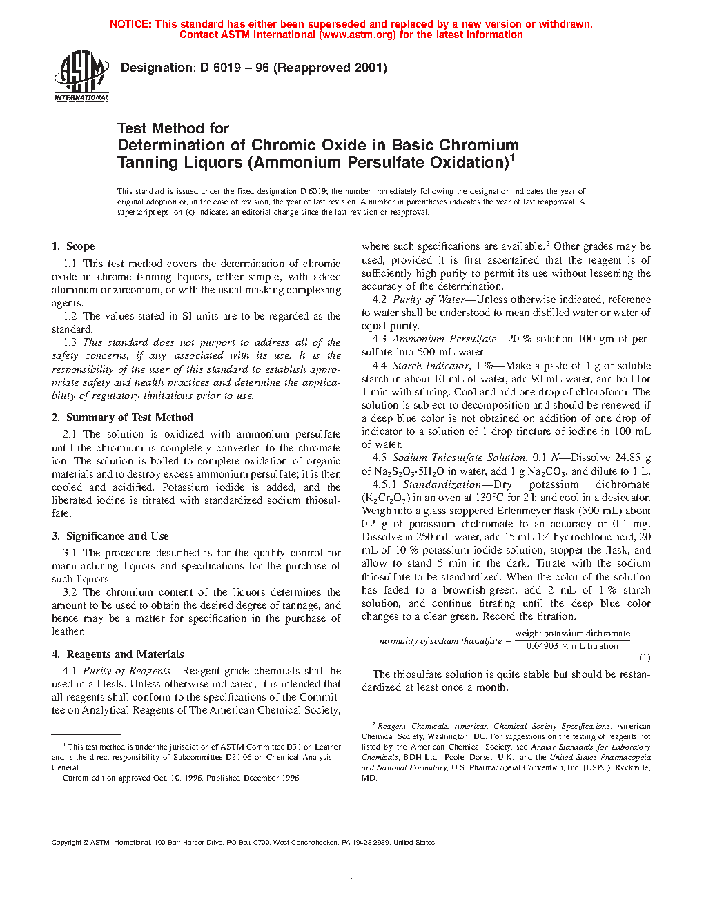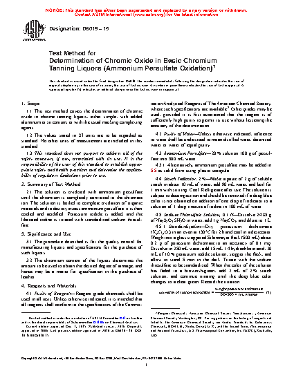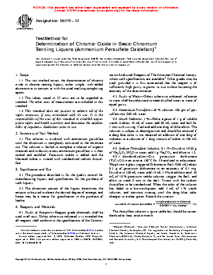 1.1 This test method covers the determination of chromic oxide in chrome tanning liquors, either simple, with added aluminum or zirconium, or with the usual masking complexing agents.