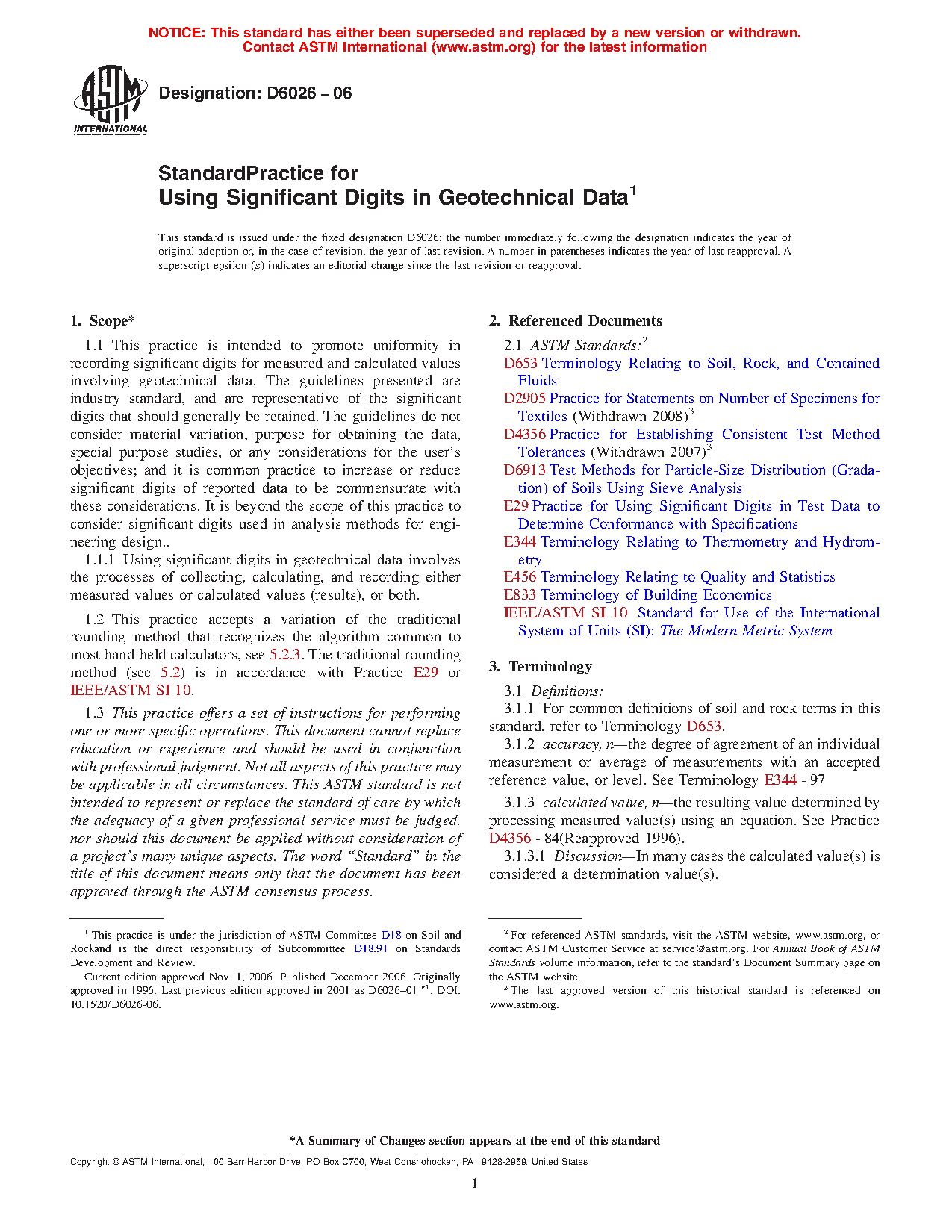 1.1 This practice is intended to promote uniformity in recording significant digits for measured and calculated values involving geotechnical data. The guidelines presented are industry standard, and are representative of the significant digits that should generally be retained. The guidelines do not consider material variation, purpose for obtaining the data, special purpose studies, or any considerations for the user's objectives; and it is common practice to increase or reduce significant digits of reported data to be commensurate with these considerations. It is beyond the scope of this practice to consider significant digits used in analysis methods for engineering design..