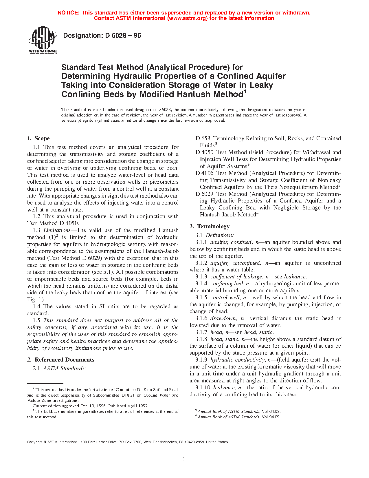 1.1 This test method covers an analytical procedure for determining the transmissivity and storage coefficient of a confined aquifer taking into consideration the change in storage of water in overlying or underlying confining beds, or both. This test method is used to analyze water-level or head data collected from one or more observation wells or piezometers during the pumping of water from a control well at a constant rate. With appropriate changes in sign, this test method also can be used to analyze the effects of injecting water into a control well at a constant rate.
