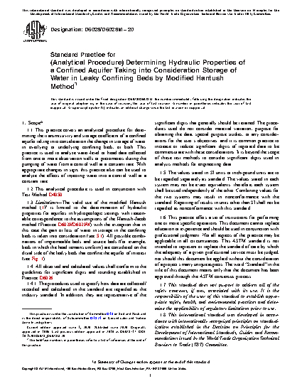 1.1 This practice covers an analytical procedure for determining the transmissivity and storage coefficient of a confined aquifer taking into consideration the change in storage of water in overlying or underlying confining beds, or both. This practice is used to analyze water-level or head data collected from one or more observation wells or piezometers during the pumping of water from a control well at a constant rate. With appropriate changes in sign, this practice also can be used to analyze the effects of injecting water into a control well at a constant rate.