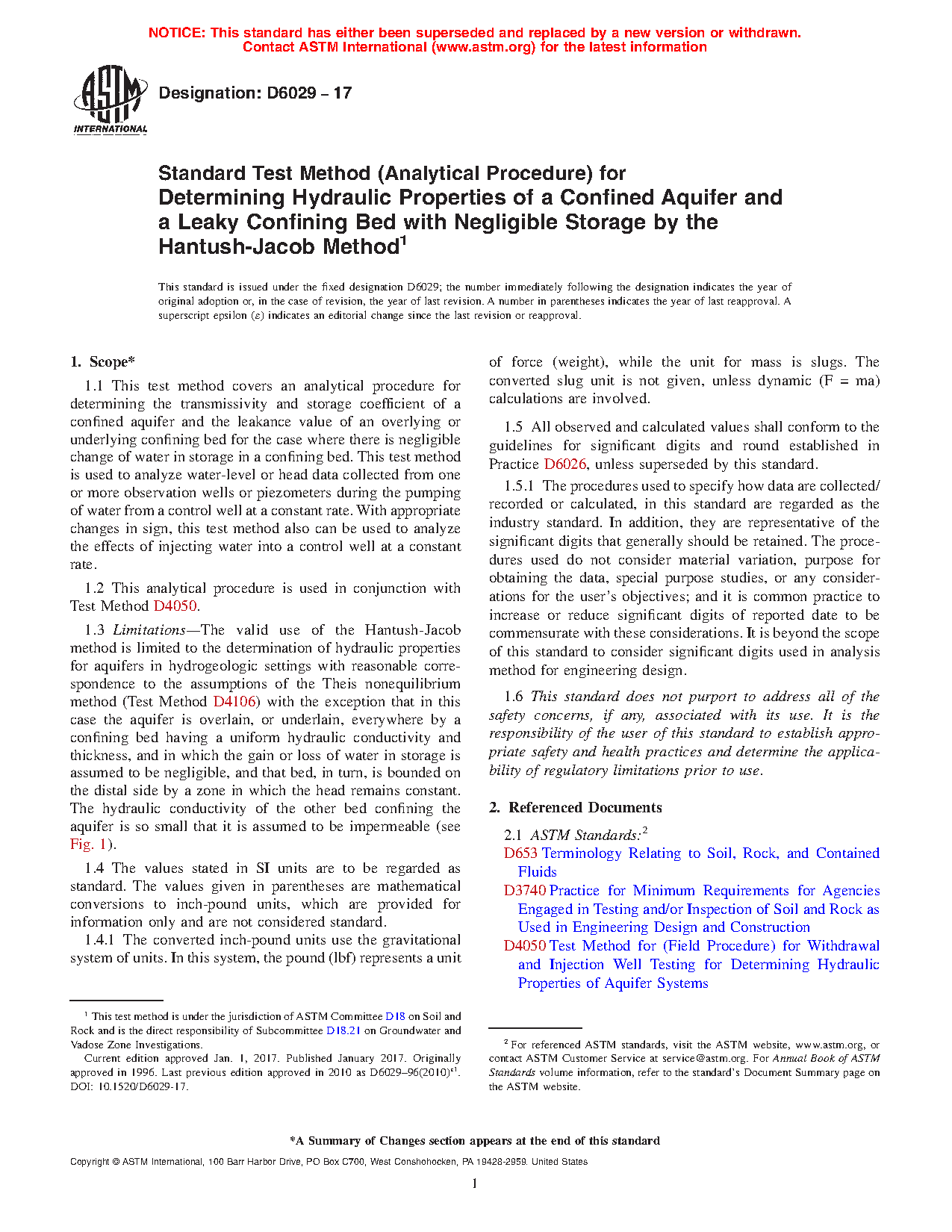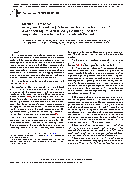 1.1 This practice covers an analytical procedure for determining the transmissivity and storage coefficient of a confined aquifer and the leakance value of an overlying or underlying confining bed for the case where there is negligible change of water in storage in a confining bed. This practice is used to analyze water-level or head data collected from one or more observation wells or piezometers during the pumping of water from a control well at a constant rate. With appropriate changes in sign, this practice also can be used to analyze the effects of injecting water into a control well at a constant rate.