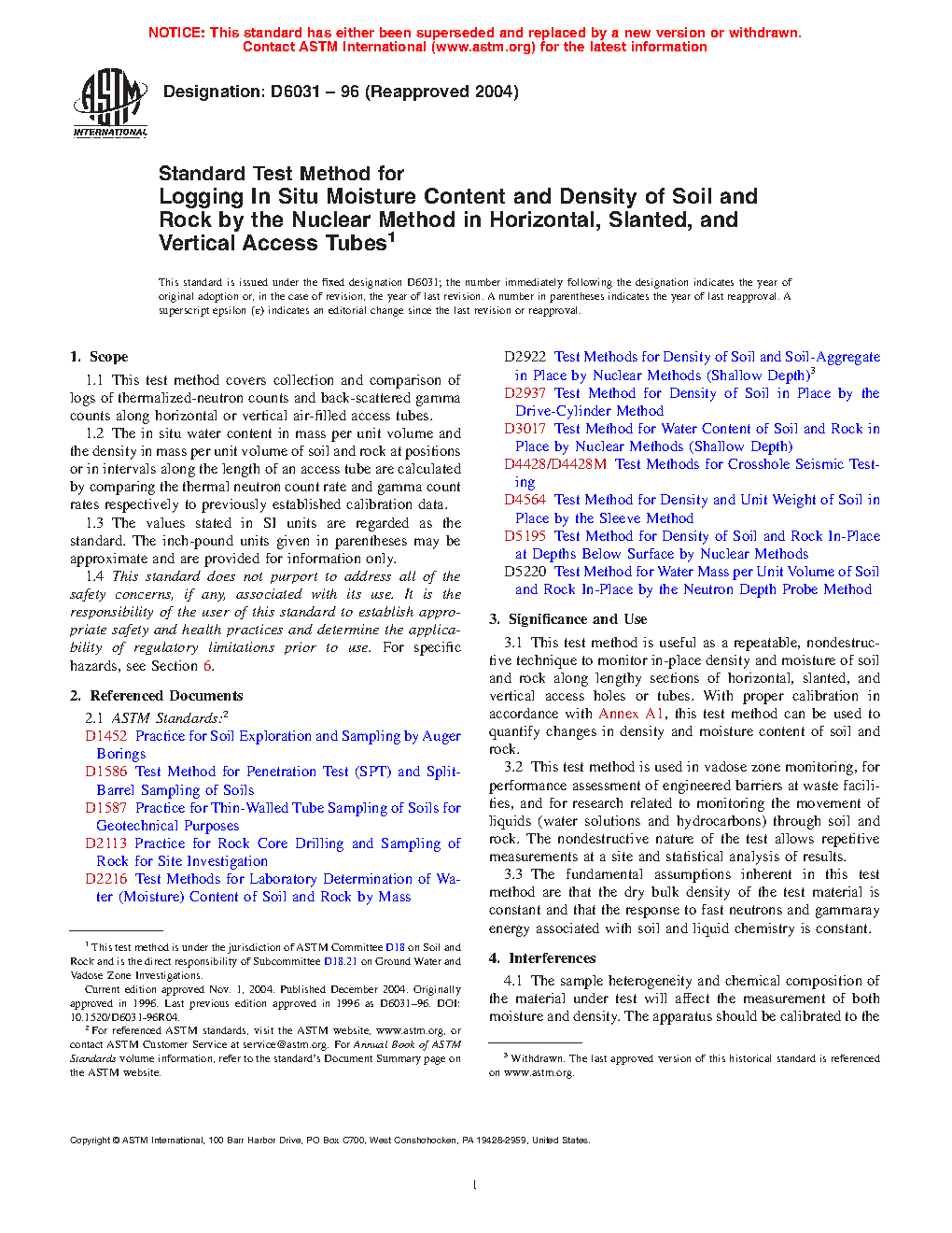 1.4 This standard does not purport to address all of the safety concerns, if any, associated with its use. It is the responsibility of the user of this standard to establish appropriate safety and health practices and determine the applicability of regulatory limitations prior to use. For specific hazards, see Section 6. This test method is useful as a repeatable, nondestructive technique to monitor in-place density and moisture of soil and rock along lengthy sections of horizontal, slanted, and vertical access holes or tubes. With proper calibration in accordance with Annex A1, this test method can be used to quantify changes in density and moisture content of soil and rock. This test method is used in vadose zone monitoring, for performance assessment of engineered barriers at waste facilities, and for research related to monitoring the movement of liquids (water solutions and hydrocarbons) through soil and rock. The nondestructive nature of the test allows repetitive measurements at a site and statistical analysis of results. The fundamental assumptions inherent in this test method are that the dry bulk density of the test material is constant and that the response to fast neutrons and gammaray energy associated with soil and liquid chemistry is constant.