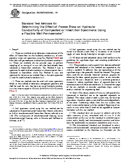 1.1 These test methods cover laboratory measurement of the effect of freeze-thaw on the hydraulic conductivity of compacted or intact soil specimens using Test Method D5084 and a flexible wall permeameter to determine hydraulic conductivity. These test methods do not provide steps to perform sampling of, or testing of, in situ soils that have already been subjected to freeze-thaw conditions. Test Method A uses a specimen for each hydraulic conductivity determination that is subjected to freeze/thaw while Test Method B uses one specimen for the entire test method (that is, the same specimen is used for each hydraulic conductivity).