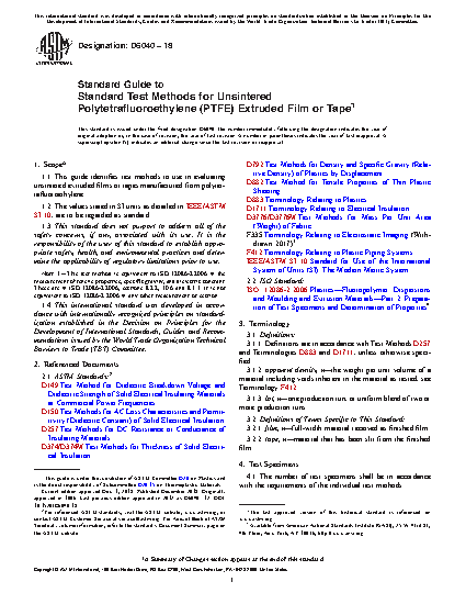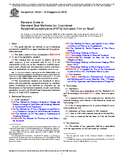 This guide identifies the standard test methods to use in evaluating unsintered extruded films or tapes manufactured from polytetrafluoroethylene (PTFE). The test methods covered here shall be capable of investigating the following material properties: width; thickness; tensile properties (tensile strength and elongation); specificat gravity (relative density); residual extrusion aids or other volatile components; dielectric constant; volume resistivity; dielectric breakdown voltage; and unit weight.