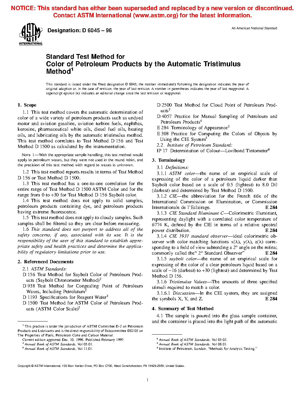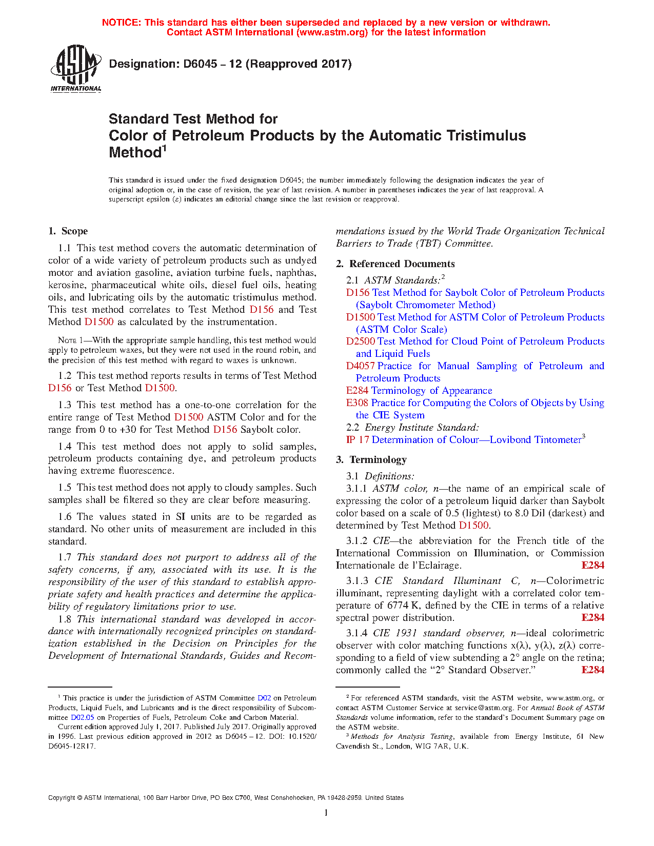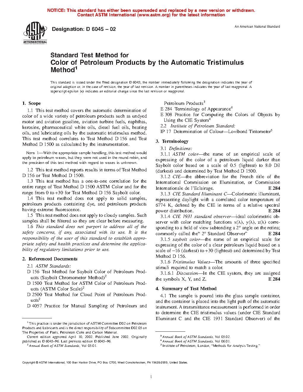1.1 This test method covers the automatic determination of color of a wide variety of petroleum products such as undyed motor and aviation gasoline, aviation turbine fuels, naphthas, kerosine, pharmaceutical white oils, diesel fuel oils, heating oils, and lubricating oils by the automatic tristimulus method. This test method correlates to Test Method D 156 and Test Method D 1500 as calculated by the instrumentation.