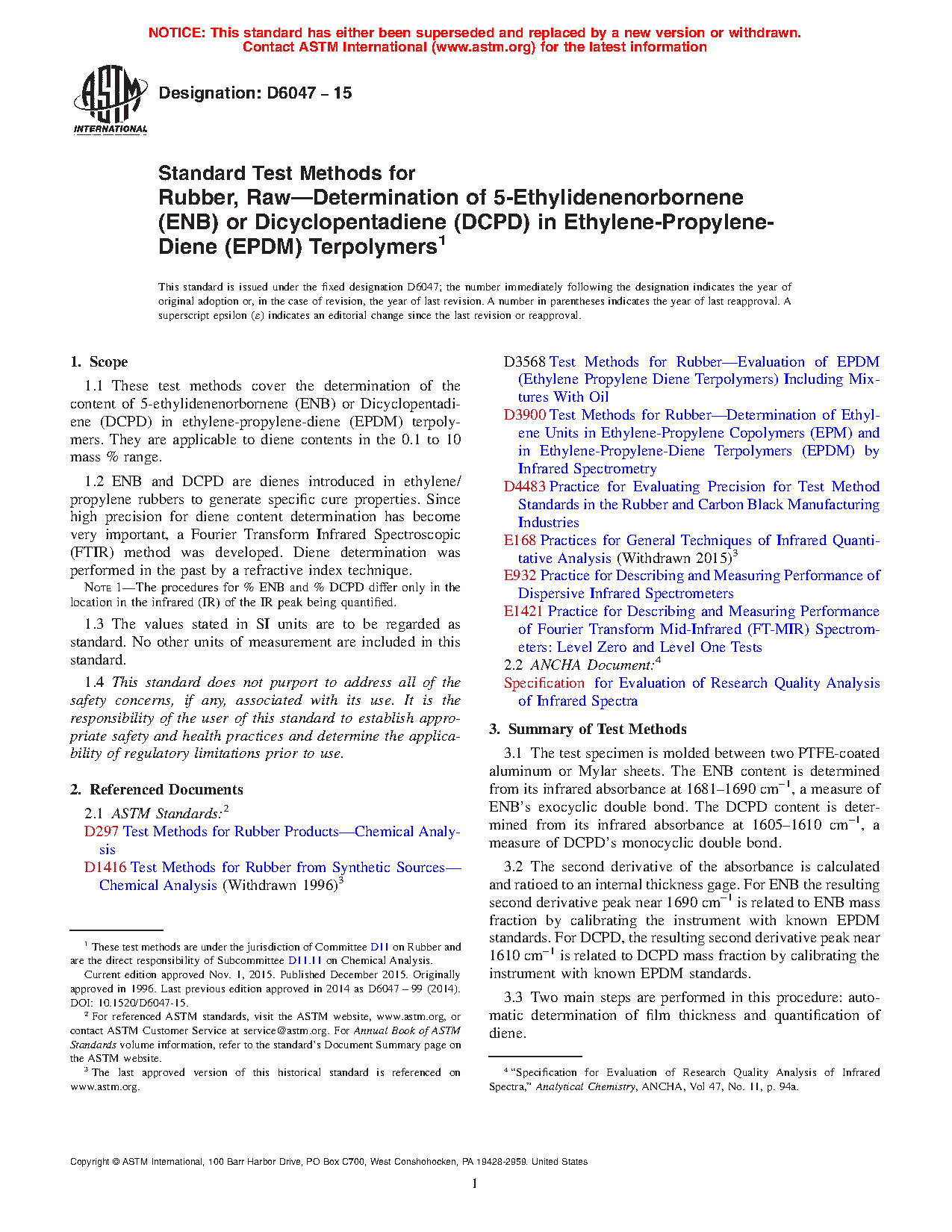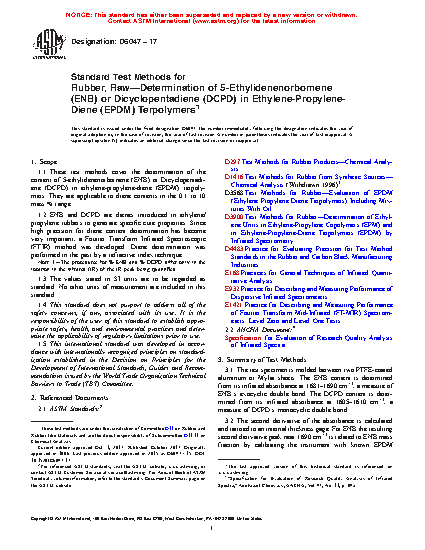 1.1 These test methods cover the determination of the content of 5-ethylidenenorbornene (ENB) in ethylene-propylene-diene (EPDM) terpolymers. They are applicable to ENB contents in the 0.1 to 10 wt % range.