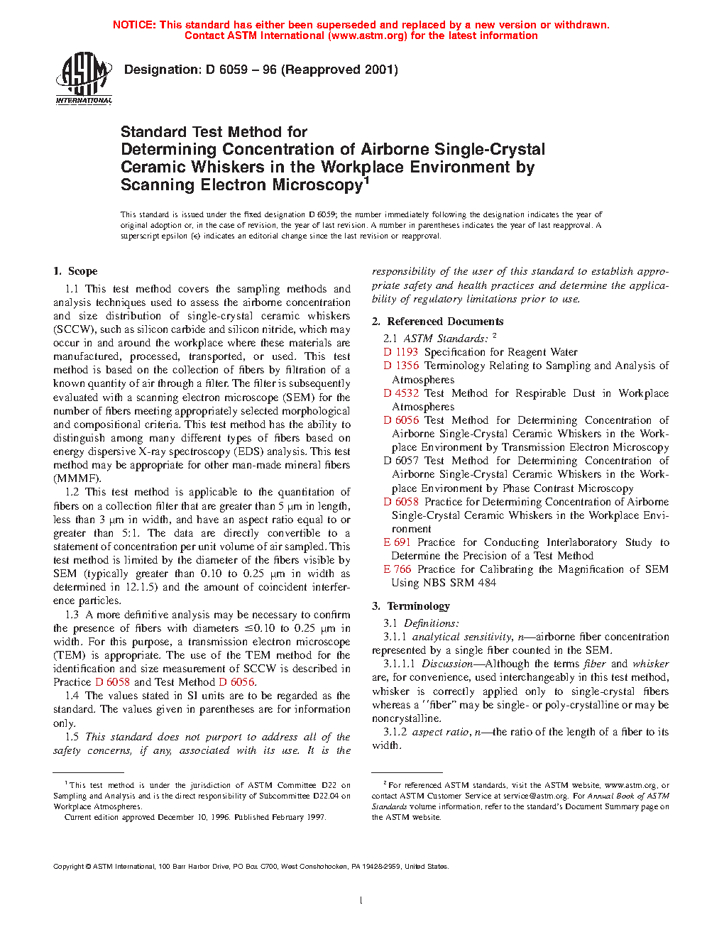 1.1 This test method covers the sampling methods and analysis techniques used to assess the airborne concentration and size distribution of single-crystal ceramic whiskers (SCCW), such as silicon carbide and silicon nitride, which may occur in and around the workplace where these materials are manufactured, processed, transported, or used. This test method is based on the collection of fibers by filtration of a known quantity of air through a filter. The filter is subsequently evaluated with a scanning electron microscope (SEM) for the number of fibers meeting appropriately selected morphological and compositional criteria. This test method has the ability to distinguish among many different types of fibers based on energy dispersive X-ray spectroscopy (EDS) analysis. This test method may be appropriate for other man-made mineral fibers (MMMF).