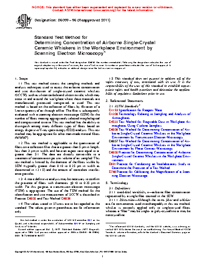 1.1 This test method covers the sampling methods and analysis techniques used to assess the airborne concentration and size distribution of single-crystal ceramic whiskers (SCCW), such as silicon carbide and silicon nitride, which may occur in and around the workplace where these materials are manufactured, processed, transported, or used. This test method is based on the collection of fibers by filtration of a known quantity of air through a filter. The filter is subsequently evaluated with a scanning electron microscope (SEM) for the number of fibers meeting appropriately selected morphological and compositional criteria. This test method has the ability to distinguish among many different types of fibers based on energy dispersive X-ray spectroscopy (EDS) analysis. This test method may be appropriate for other man-made mineral fibers (MMMF).