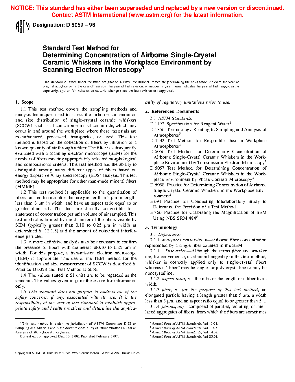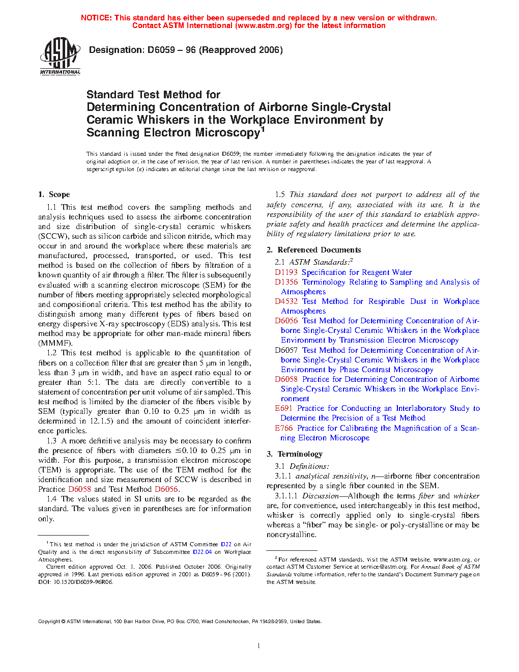 1.3 A more definitive analysis may be necessary to confirm the presence of fibers with diameters ≤0.10 to 0.25 μm in width. For this purpose, a transmission electron microscope (TEM) is appropriate. The use of the TEM method for the identification and size measurement of SCCW is described in Practice D6058 and Test Method D6056.