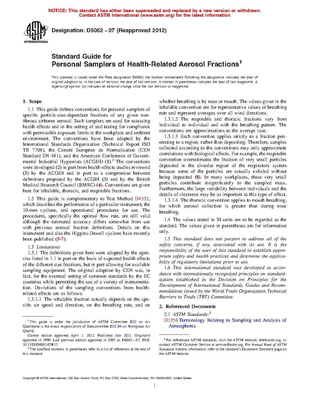1.1 This guide defines conventions for personal samplers of specific particle-size-dependent fractions of any given non-fibrous airborne aerosol. Such samplers are used for assessing health effects and in the setting of and testing for compliance with permissible exposure limits in the workplace and ambient environment. The conventions have been adopted by the International Standards Organization (ISO 7708), the Comité Européen de Normalisation (CEN EN 481), and the American Conference of Governmental Industrial Hygienists (ACGIH) (1).2 The conventions were developed (2) in part from health-effects studies reviewed (3) by the ACGIH and in part as a compromise between definitions proposed by the ACGIH (3) and by the British Medical Research Council (BMRC) (4). Conventions are given here for inhalable, thoracic, and respirable fractions.