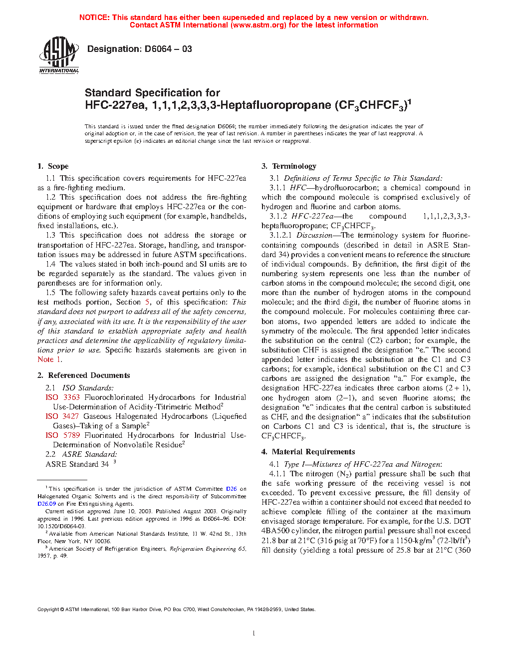 1.1 This specification covers requirements for HFC-227ea as a fire-fighting medium.