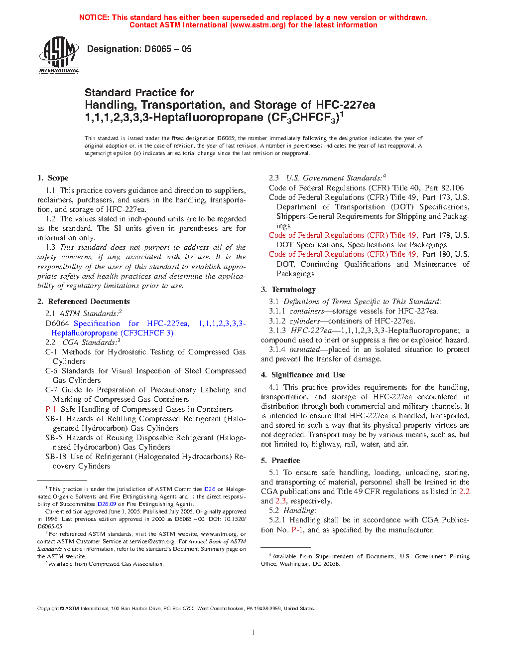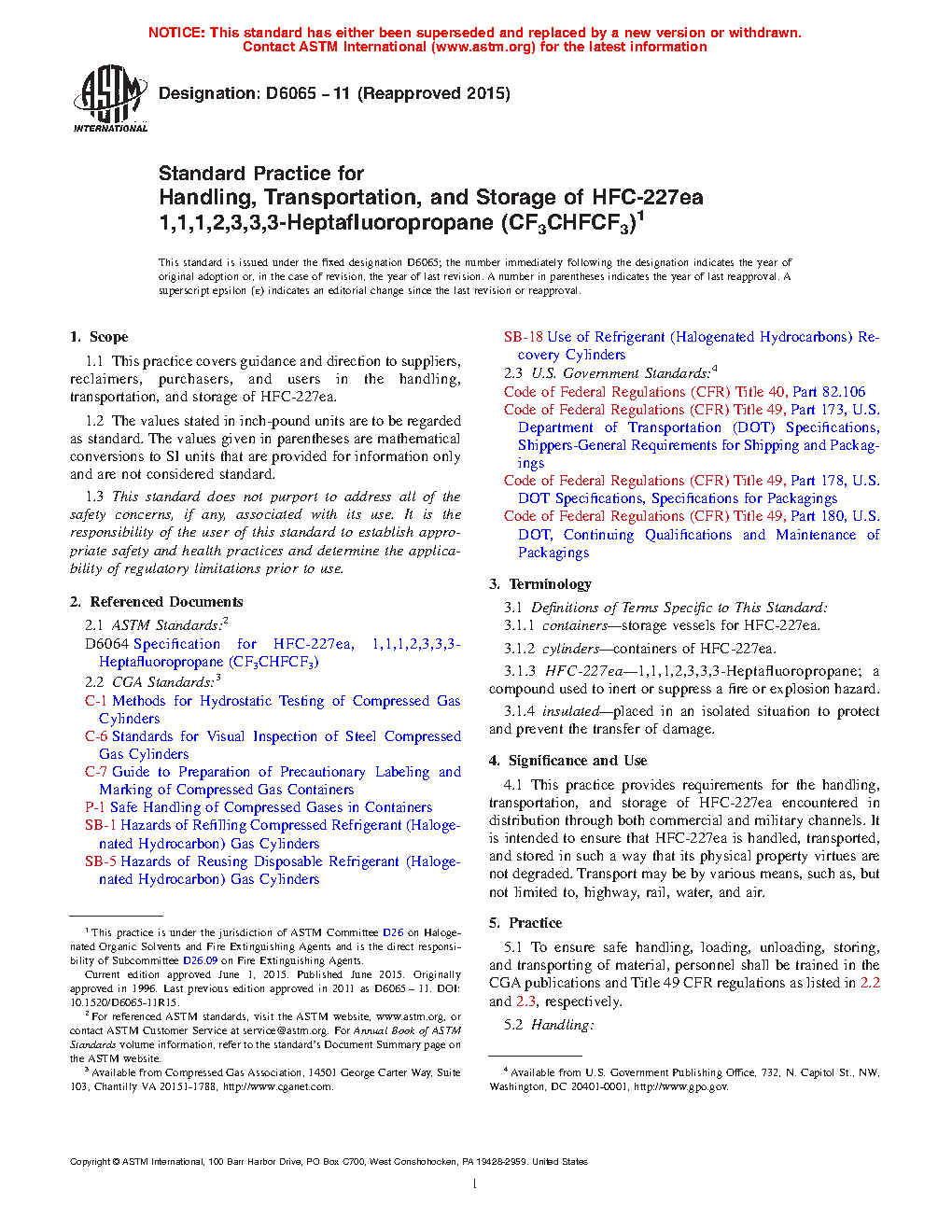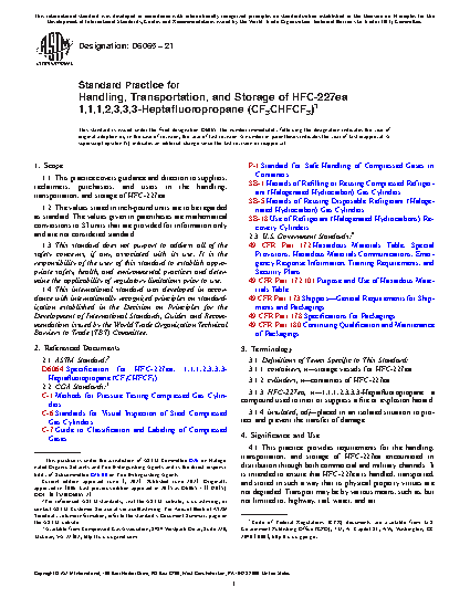 1.1 This practice covers guidance and direction to suppliers, reclaimers, purchasers, and users in the handling, transportation, and storage of HFC-227ea.