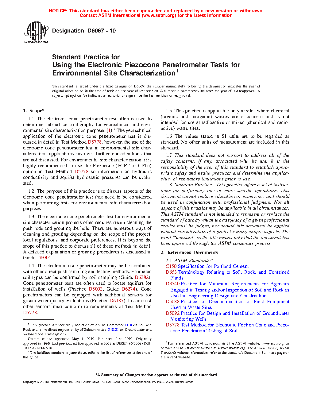 1.3 The electronic cone penetrometer test for environmental site characterization projects often requires steam cleaning the push rods and grouting the hole. There are numerous ways of cleaning and grouting depending on the scope of the project, local regulations, and corporate preferences. It is beyond the scope of this practice to discuss all of these methods in detail. A detailed explanation of grouting procedures is discussed in Guide D6001.
