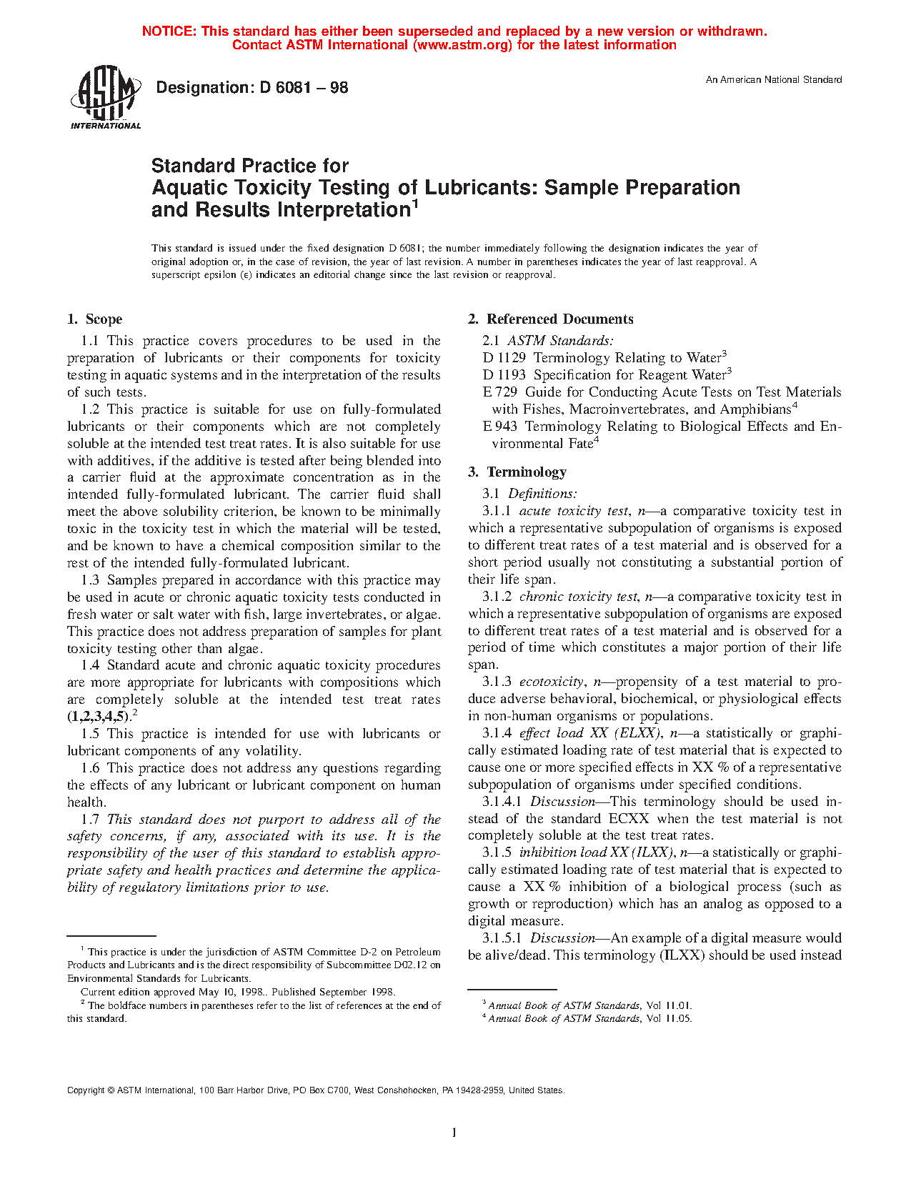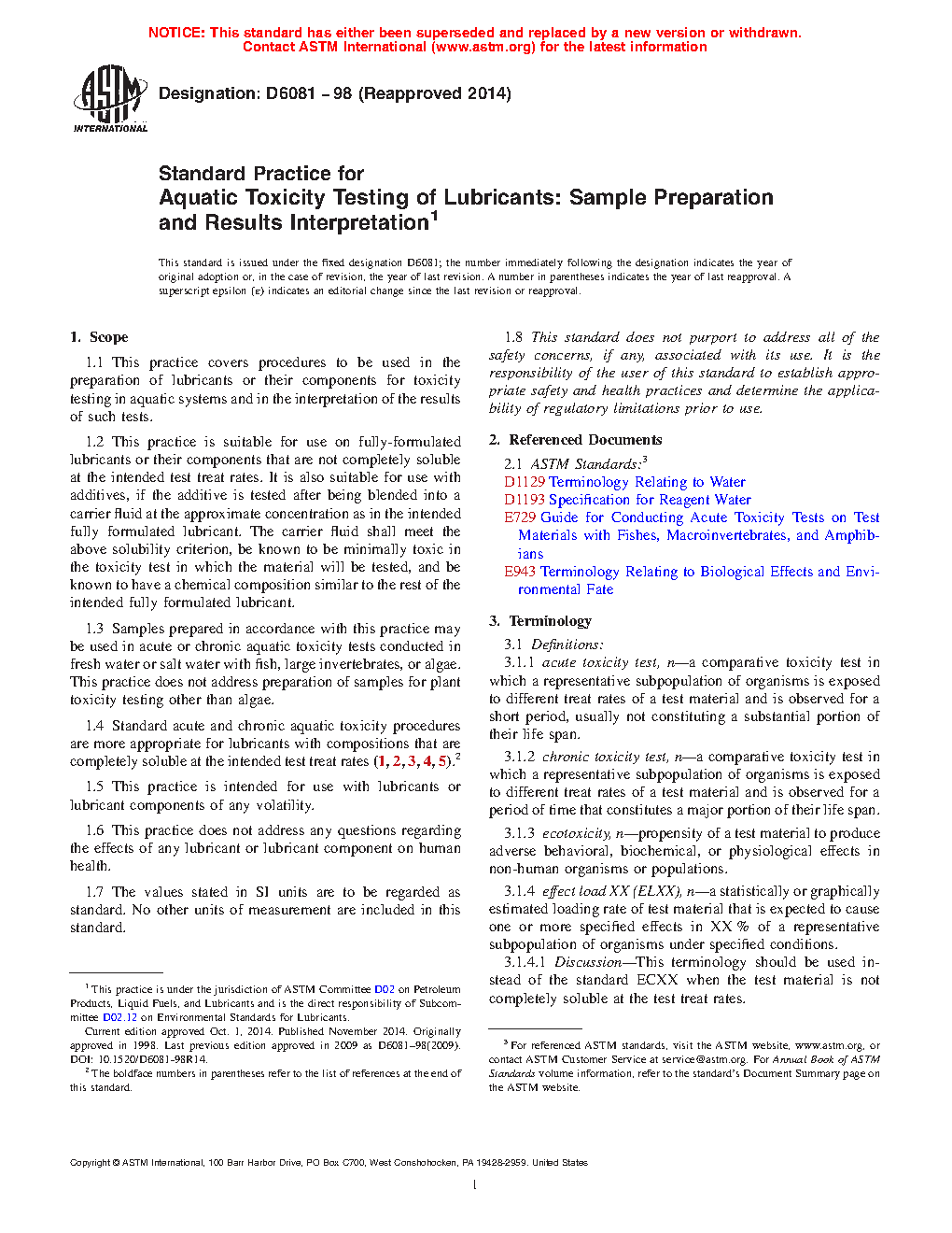 1.4 Standard acute and chronic aquatic toxicity procedures are more appropriate for lubricants with compositions that are completely soluble at the intended test treat rates (1, 2, 3, 4, 5).