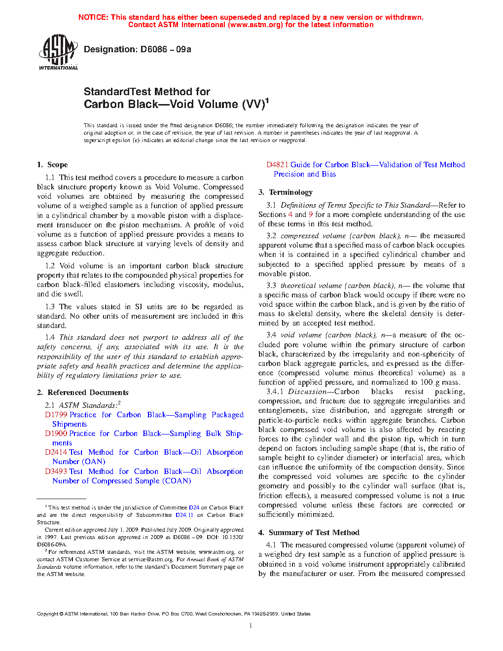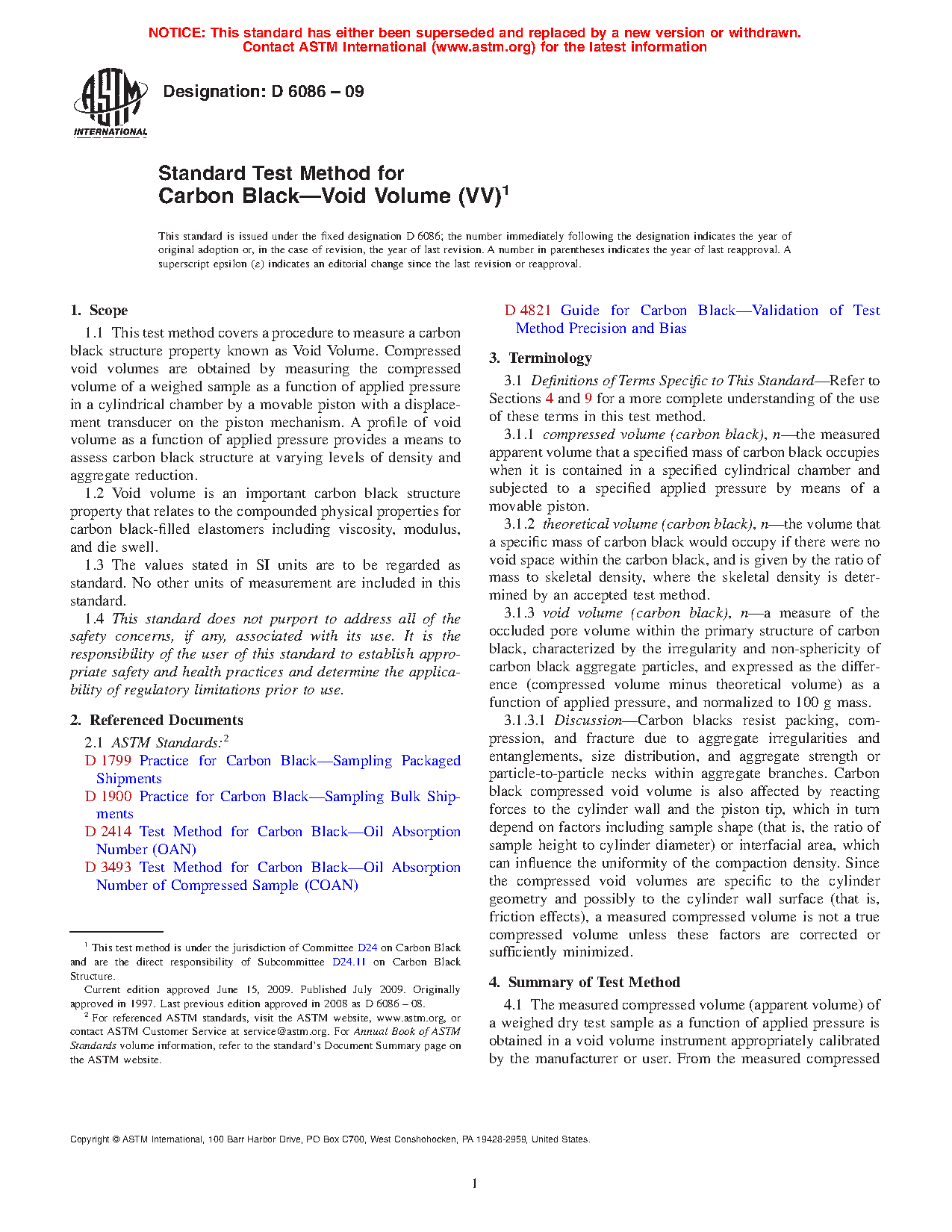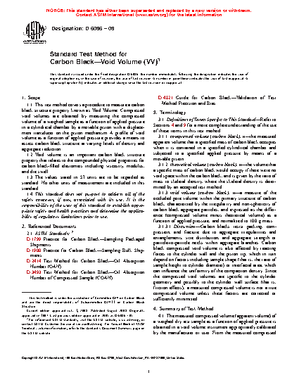 1.1 This test method covers a procedure to measure a carbon black structure property known as Void Volume. Compressed void volumes are obtained by measuring the compressed volume of a weighed sample as a function of applied pressure in a cylindrical chamber by a movable piston with a displacement transducer on the piston mechanism. A profile of void volume as a function of applied pressure provides a means to assess carbon black structure at varying levels of density and aggregate reduction.