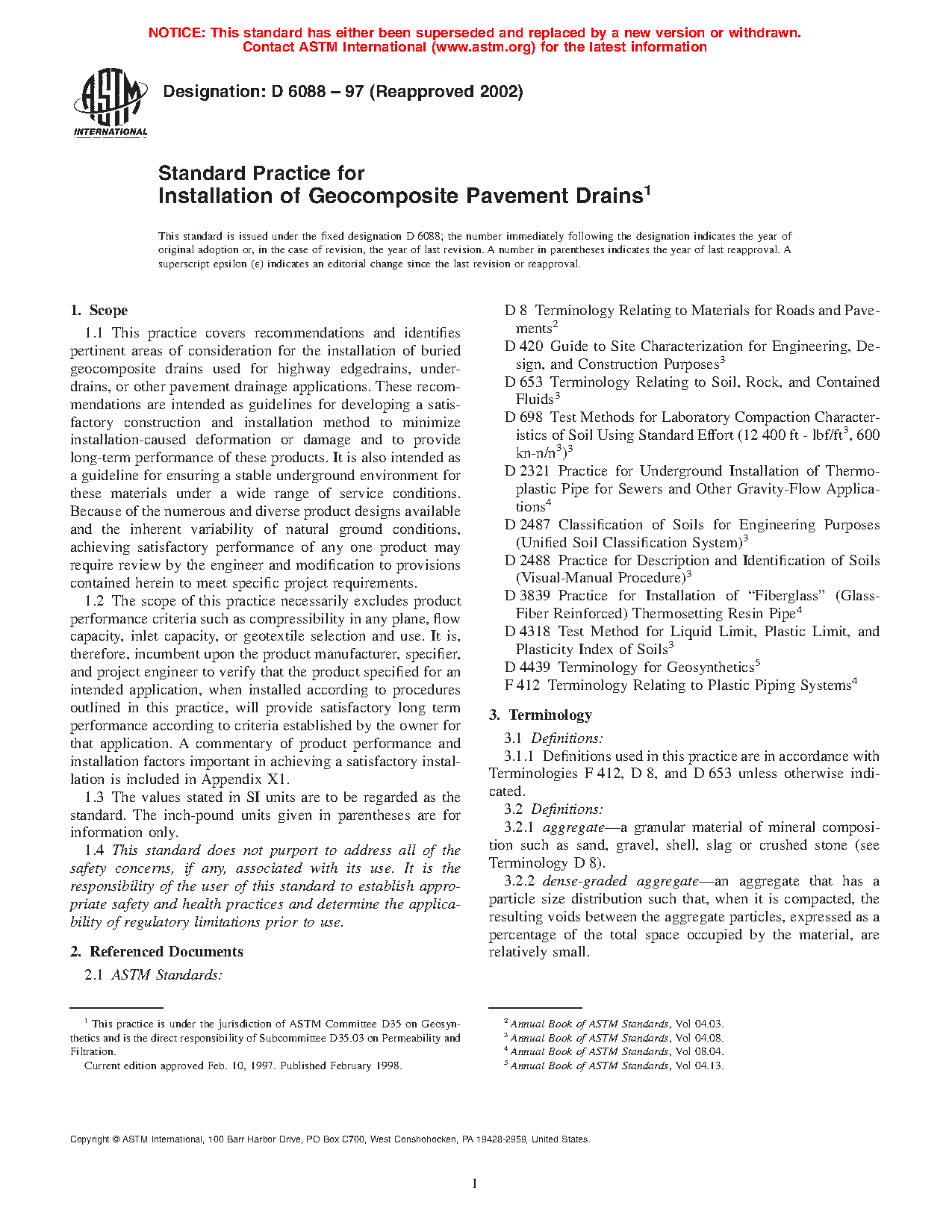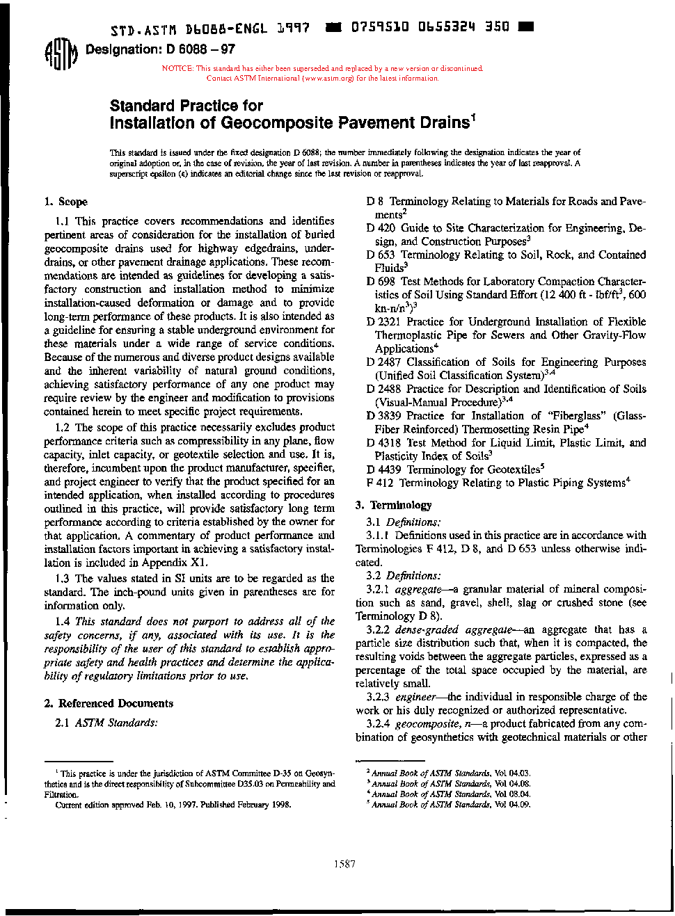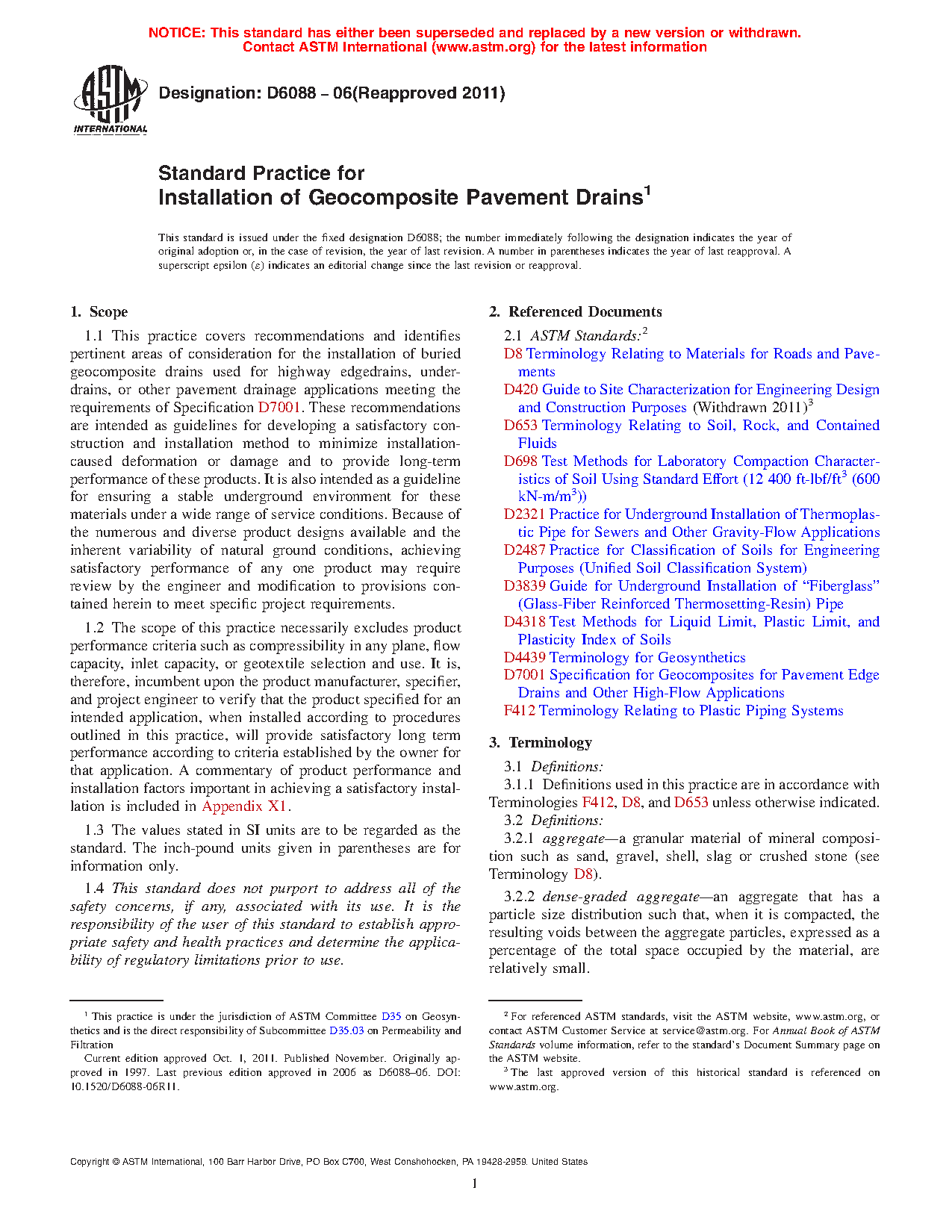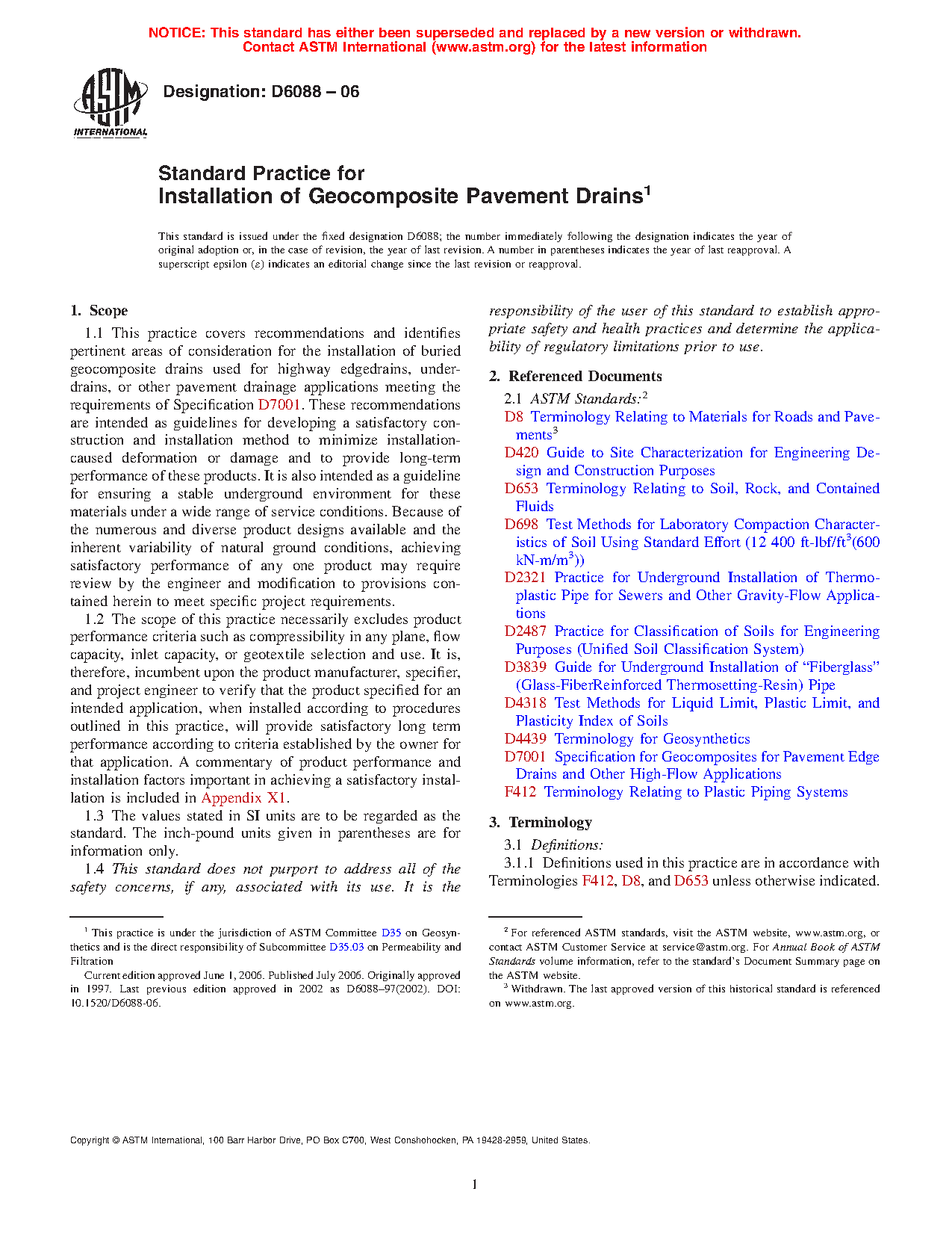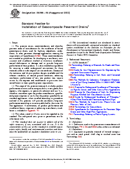 1.1 This practice covers recommendations and identifies pertinent areas of consideration for the installation of buried geocomposite drains used for highway edgedrains, under-drains, or other pavement drainage applications meeting the requirements of Specification D7001. These recommendations are intended as guidelines for developing a satisfactory construction and installation method to minimize installation-caused deformation or damage and to provide long-term performance of these products. It is also intended as a guideline for ensuring a stable underground environment for these materials under a wide range of service conditions. Because of the numerous and diverse product designs available and the inherent variability of natural ground conditions, achieving satisfactory performance of any one product may require review by the engineer and modification to provisions contained herein to meet specific project requirements.