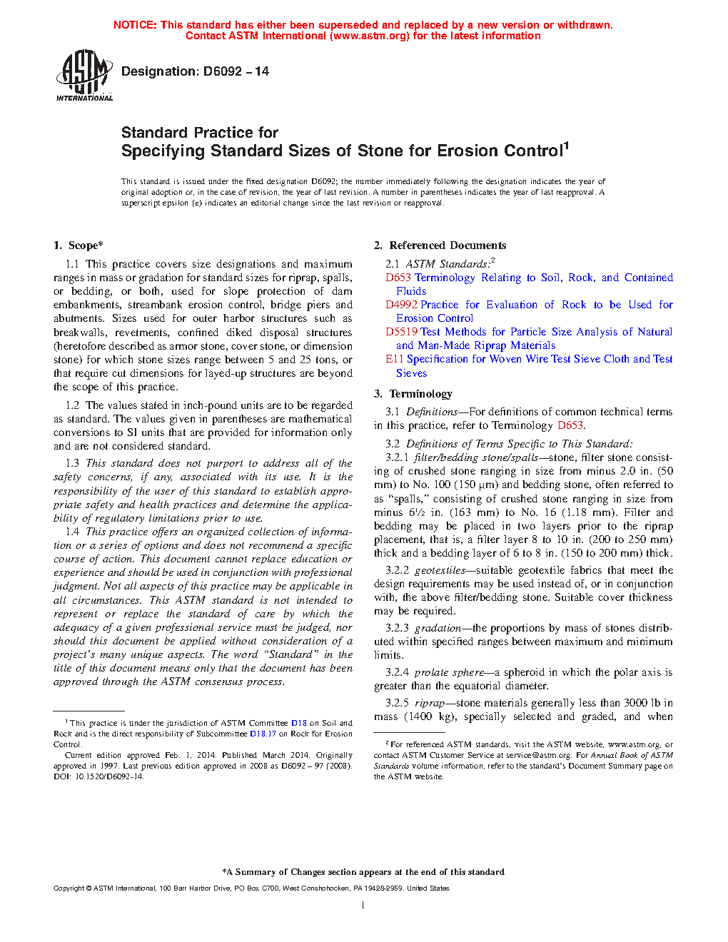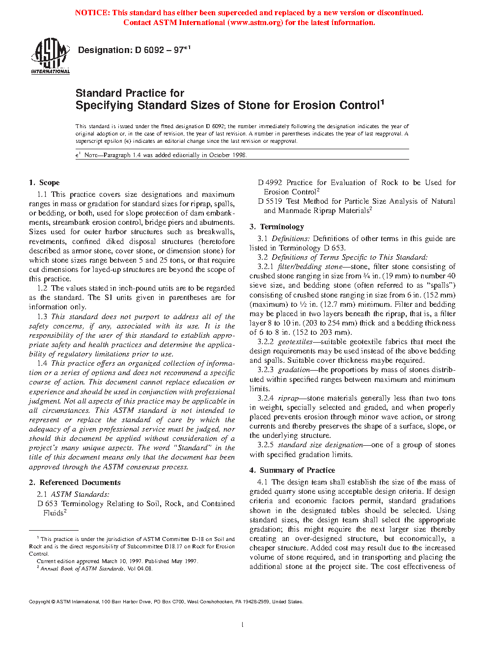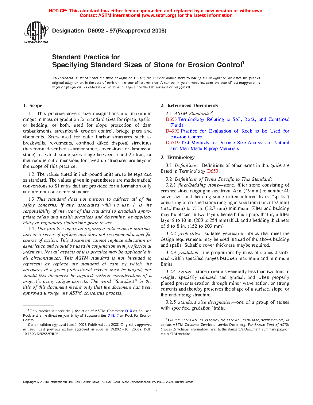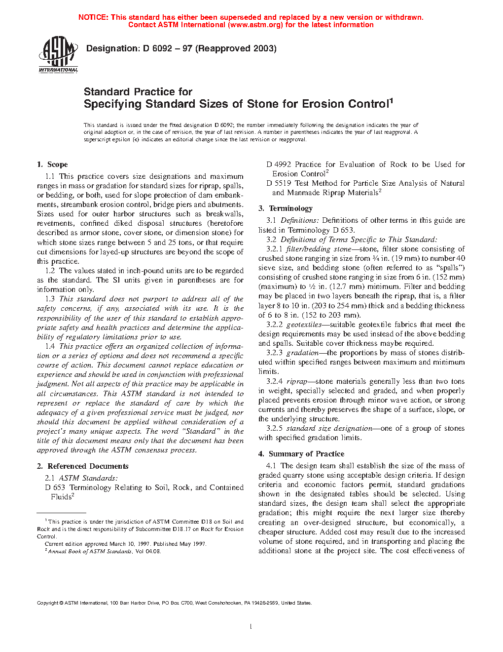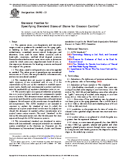 1.1 This practice covers size designations and maximum ranges in mass or gradation for standard sizes for riprap, spalls, or bedding, or both, used for slope protection of dam embankments, streambank erosion control, bridge piers and abutments. Sizes used for outer harbor structures such as breakwalls, revetments, confined diked disposal structures (heretofore described as armor stone, cover stone, or dimension stone) for which stone sizes range between 5 and 25 tons, or that require cut dimensions for layed-up structures are beyond the scope of this practice.