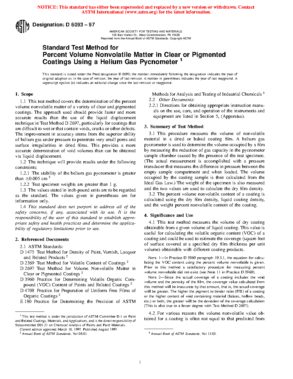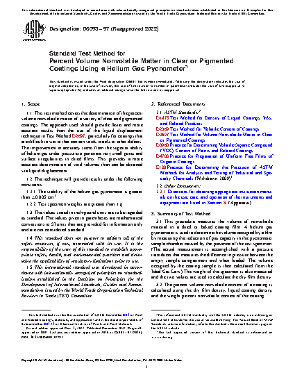 1.1 This test method covers the determination of the percent volume nonvolatile matter of a variety of clear and pigmented coatings. The approach used should provide faster and more accurate results than the use of liquid displacement technique in Test Method D 2697, particularly for coatings that are difficult to wet or that contain voids, cracks or other defects. The improvement in accuracy stems from the superior ability of helium gas under pressure to penetrate very small pores and surface irregularities in dried films. This provides a more accurate determination of void volumes than can be obtained via liquid displacement.