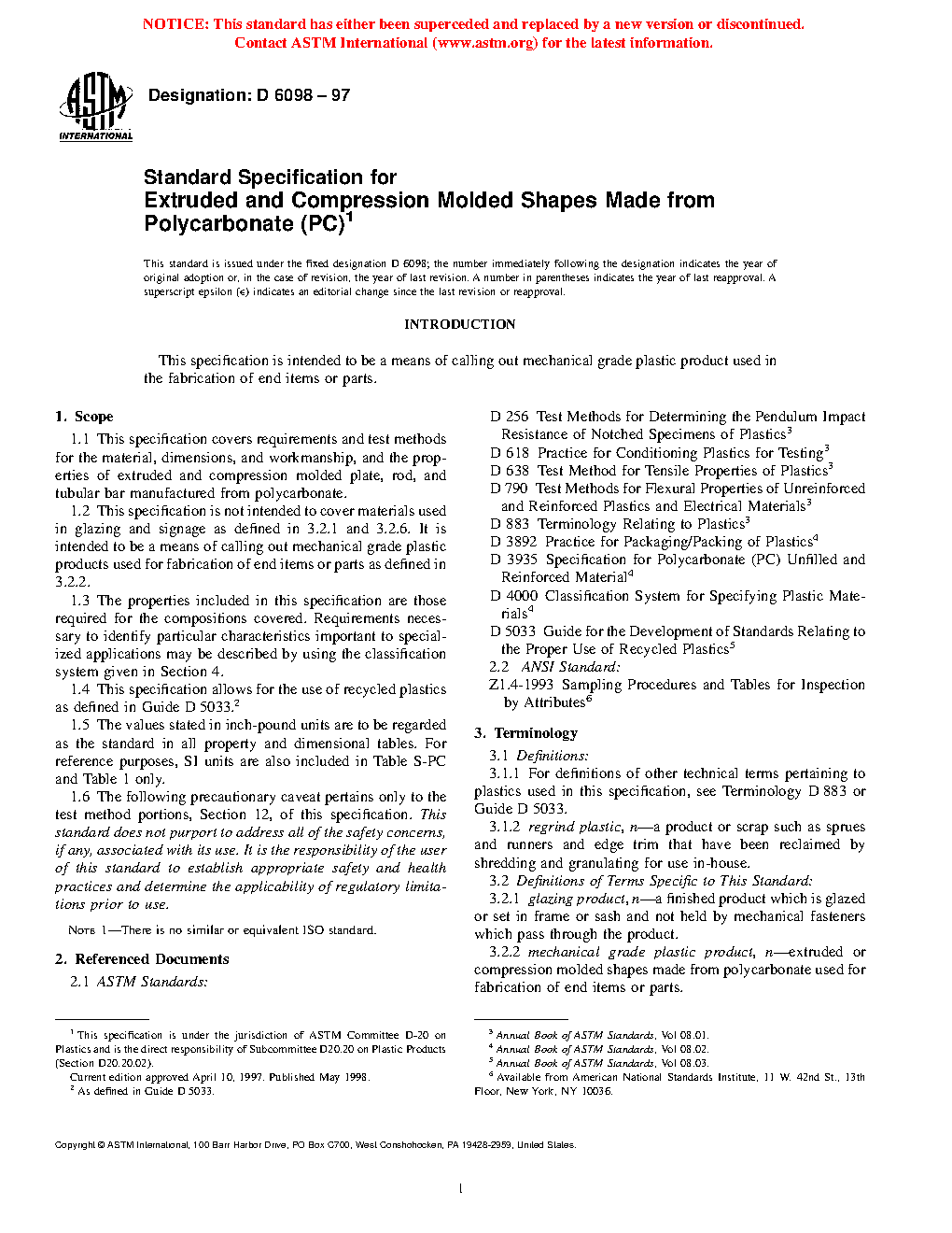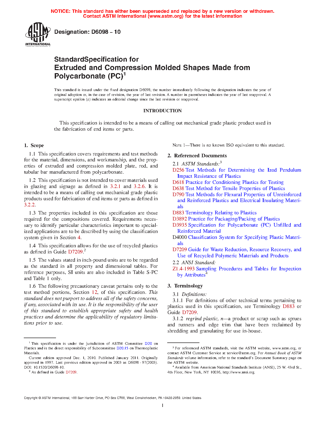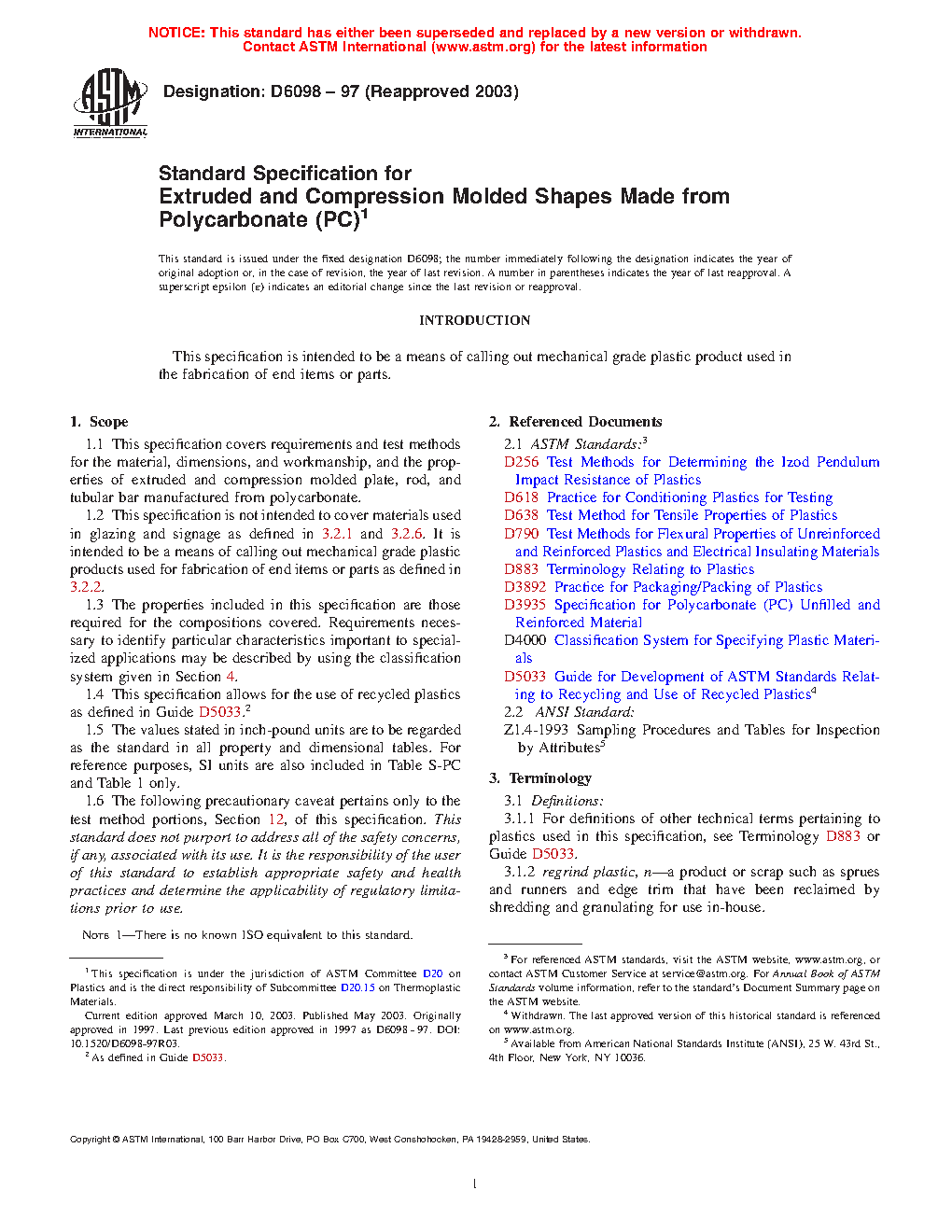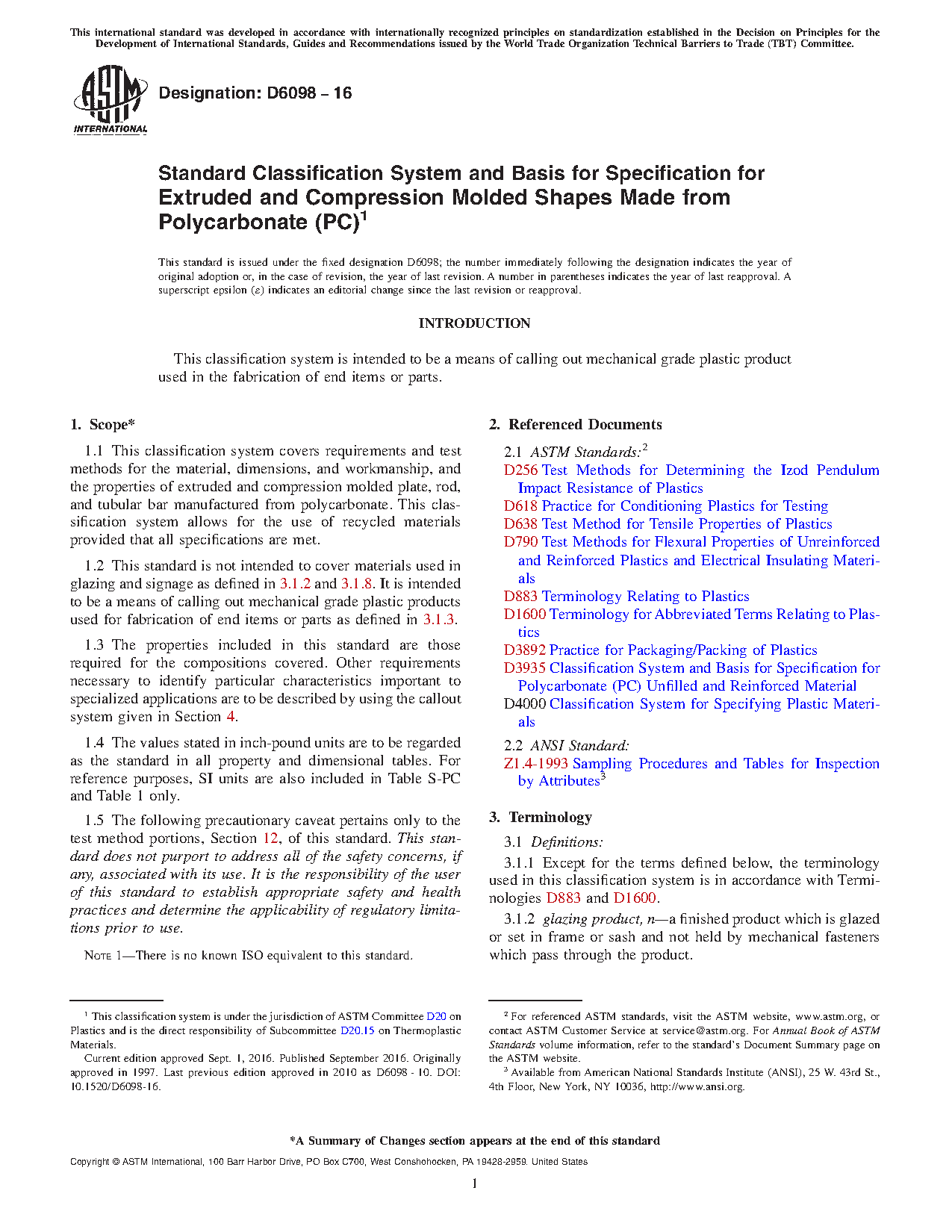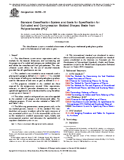 1.1 This classification system covers requirements and test methods for the material, dimensions, and workmanship, and the properties of extruded and compression molded plate, rod, and tubular bar manufactured from polycarbonate. This classification system allows for the use of recycled materials provided that all specifications are met.