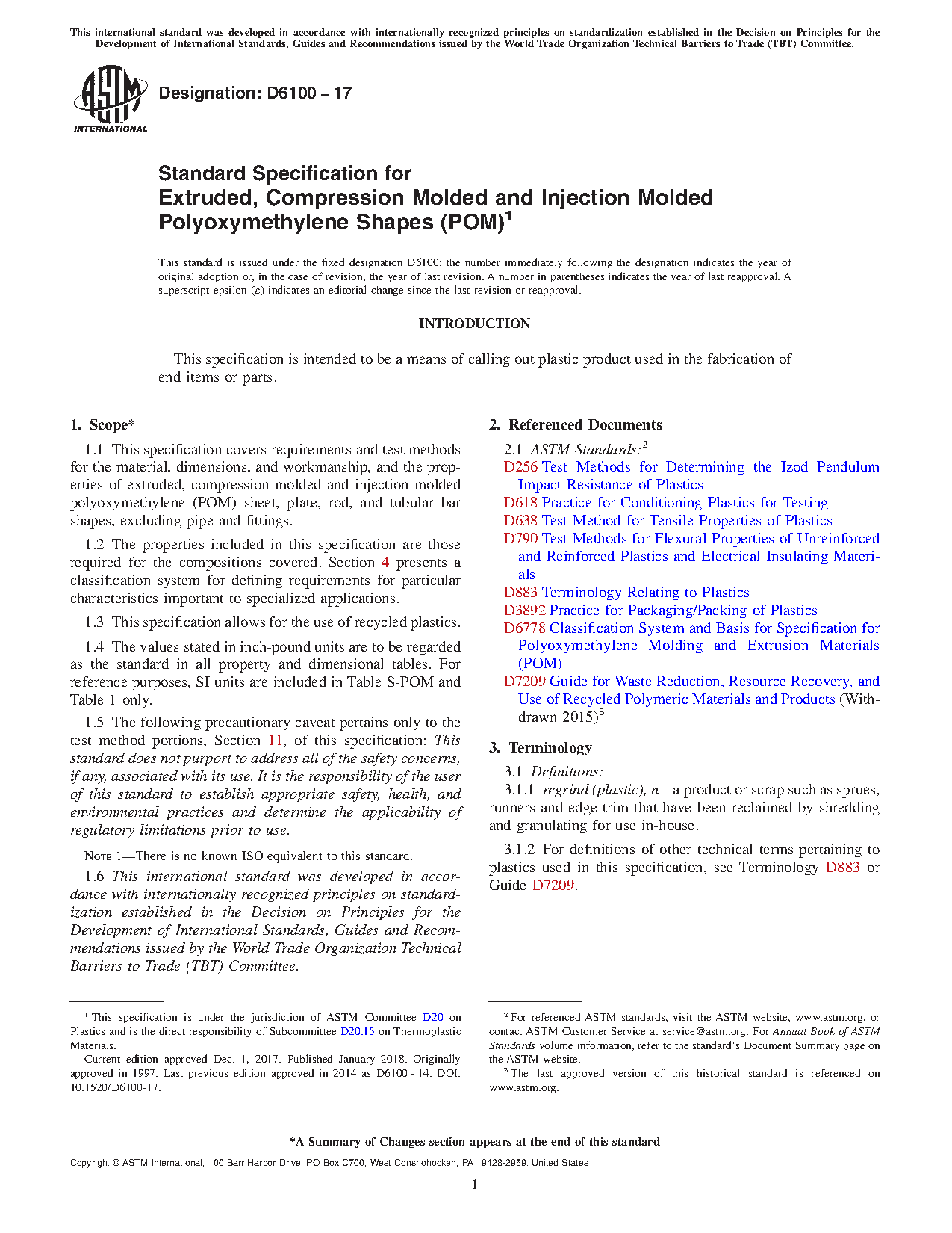1.1 This specification covers requirements and test methods for the material, dimensions, and workmanship, and the properties of extruded, compression molded and injection molded polyoxymethylene (POM) sheet, plate, rod, and tubular bar shapes, excluding pipe and fittings.