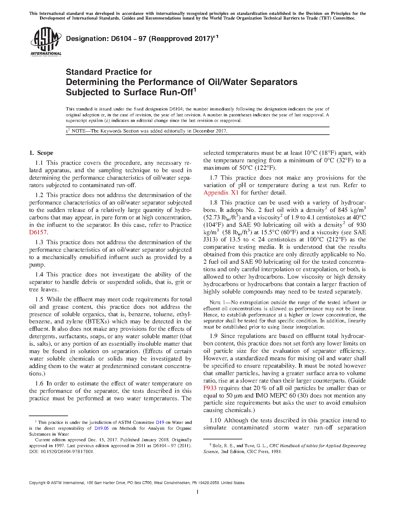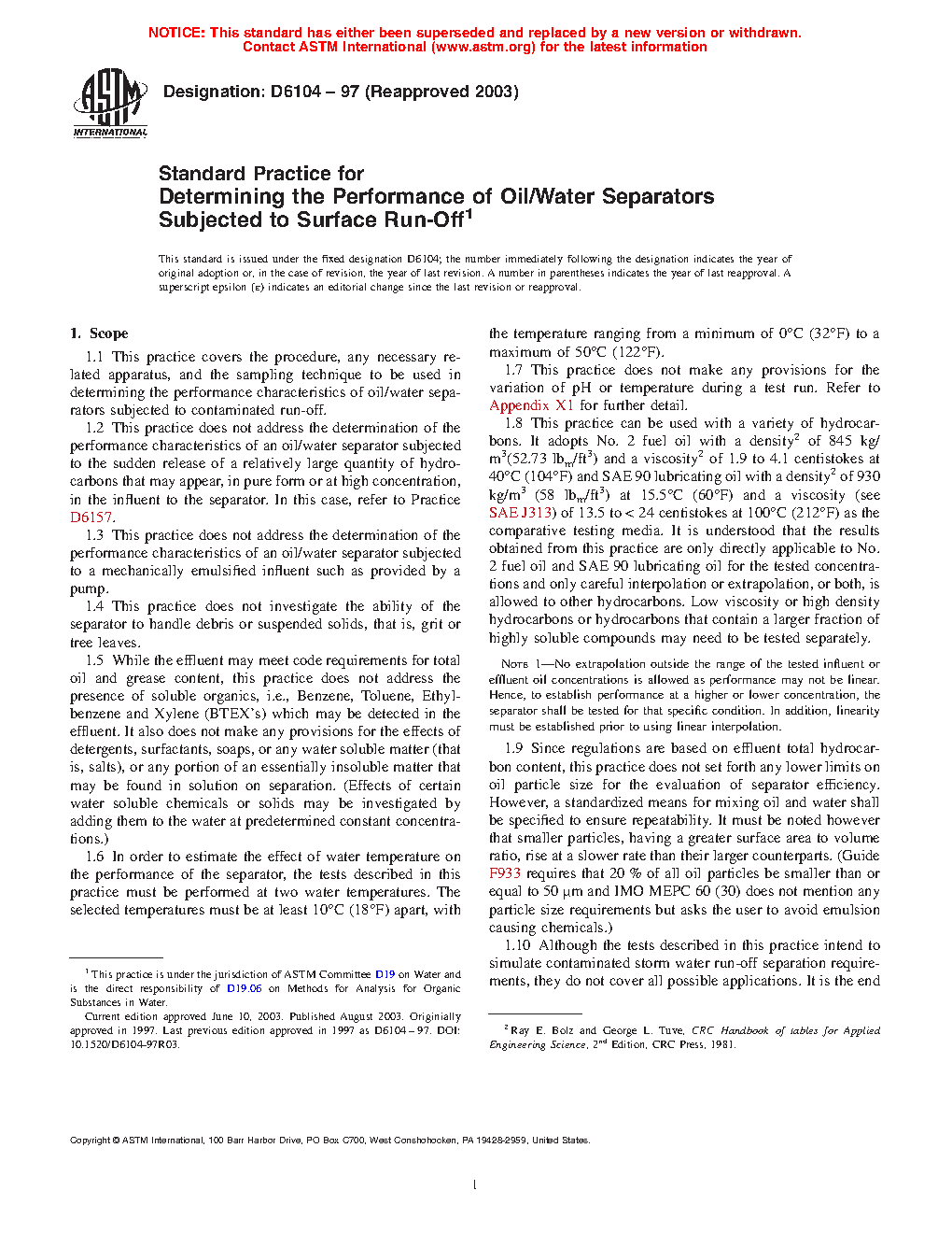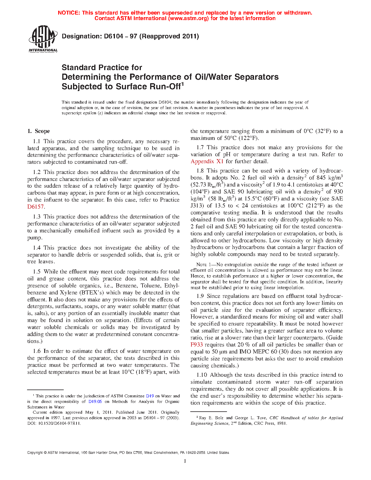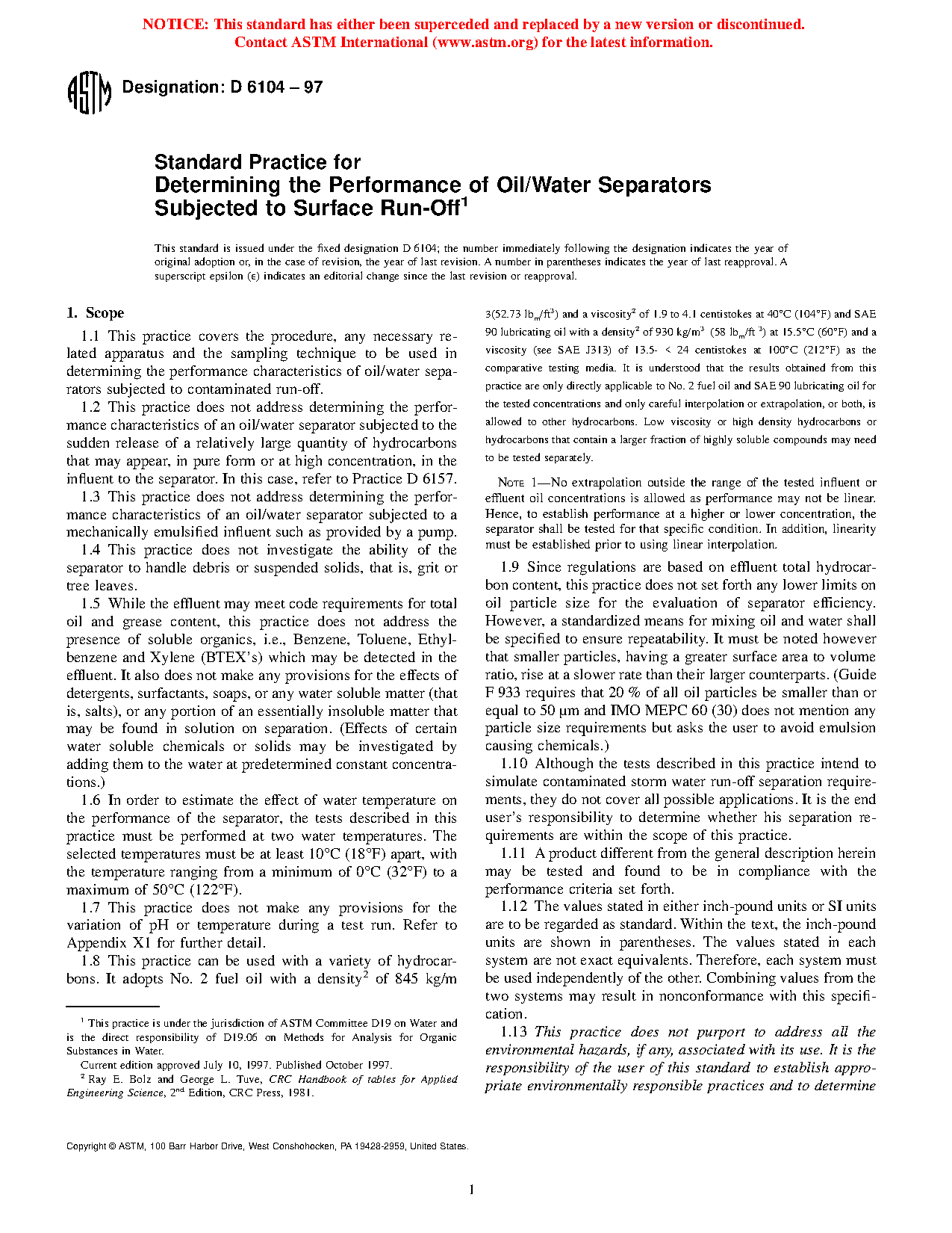 1.10 Although the tests described in this practice intend to simulate contaminated storm water run-off separation requirements, they do not cover all possible applications. It is the end user's responsibility to determine whether his separation requirements are within the scope of this practice.