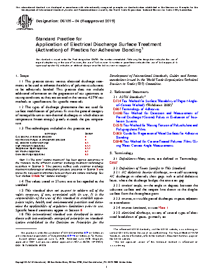 1.1 This practice covers various electrical discharge treatments to be used to enhance the ability of polymeric substrates to be adhesively bonded. This practice does not include additional information on the preparation of test specimens or testing conditions as they are covered in the various ASTM test methods or specifications for specific materials.