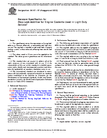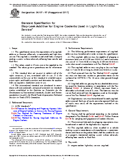 1.1 This specification covers the requirements of a stop-leak additive to function effectively in automobile and light duty service. The stop-leak is intended to seal small leaks in engine cooling systems without adversely affecting heat transfer and fluid flow.