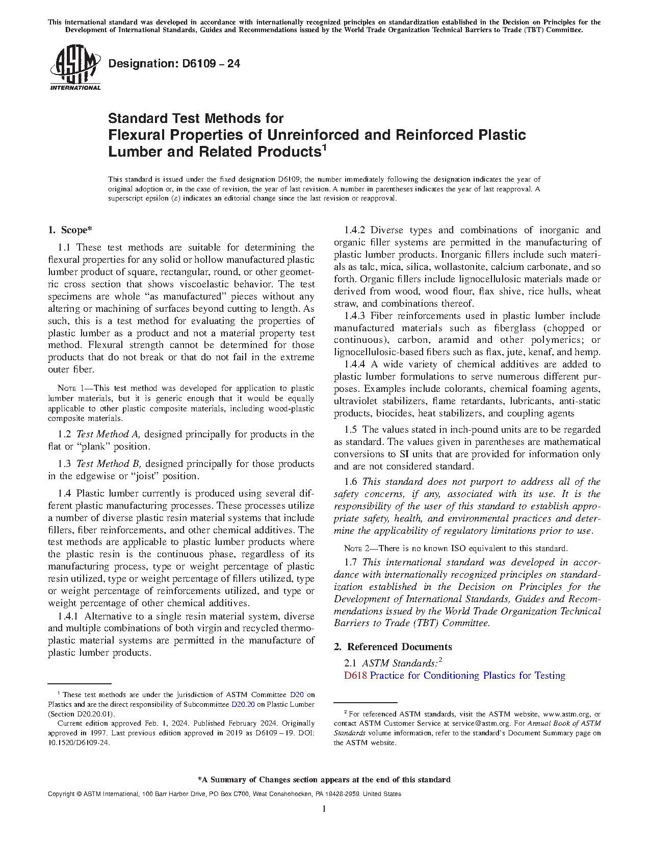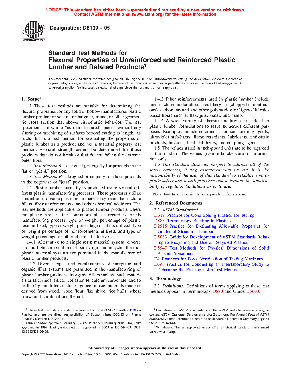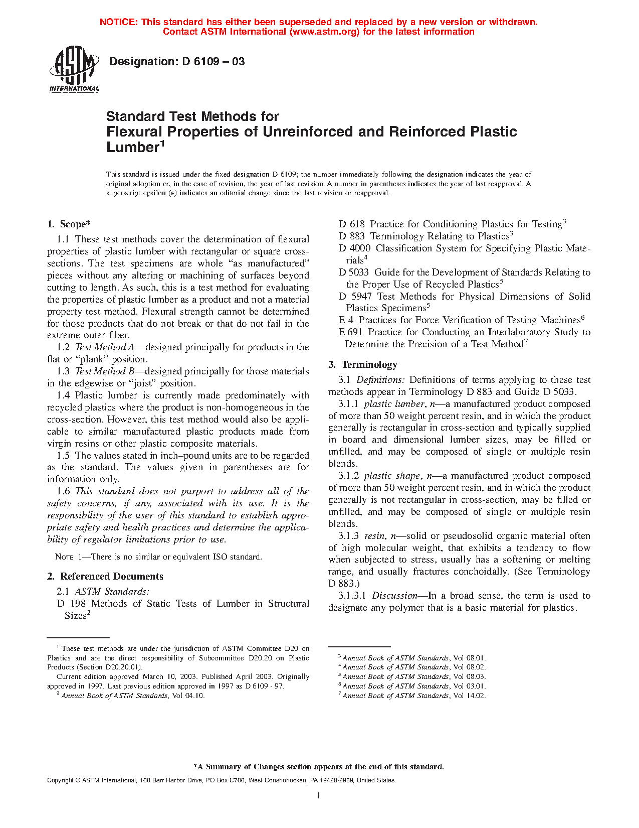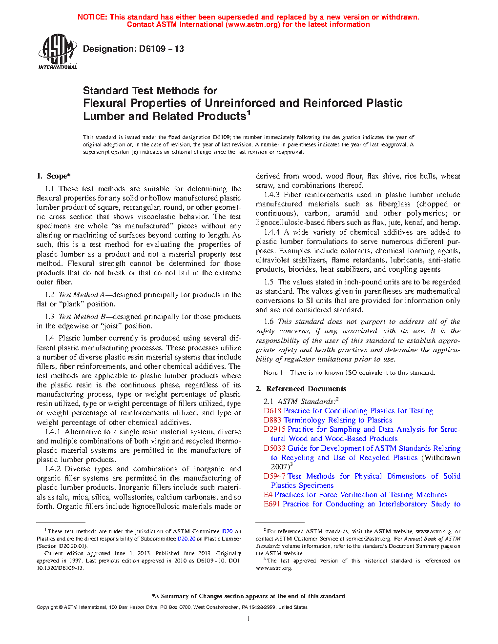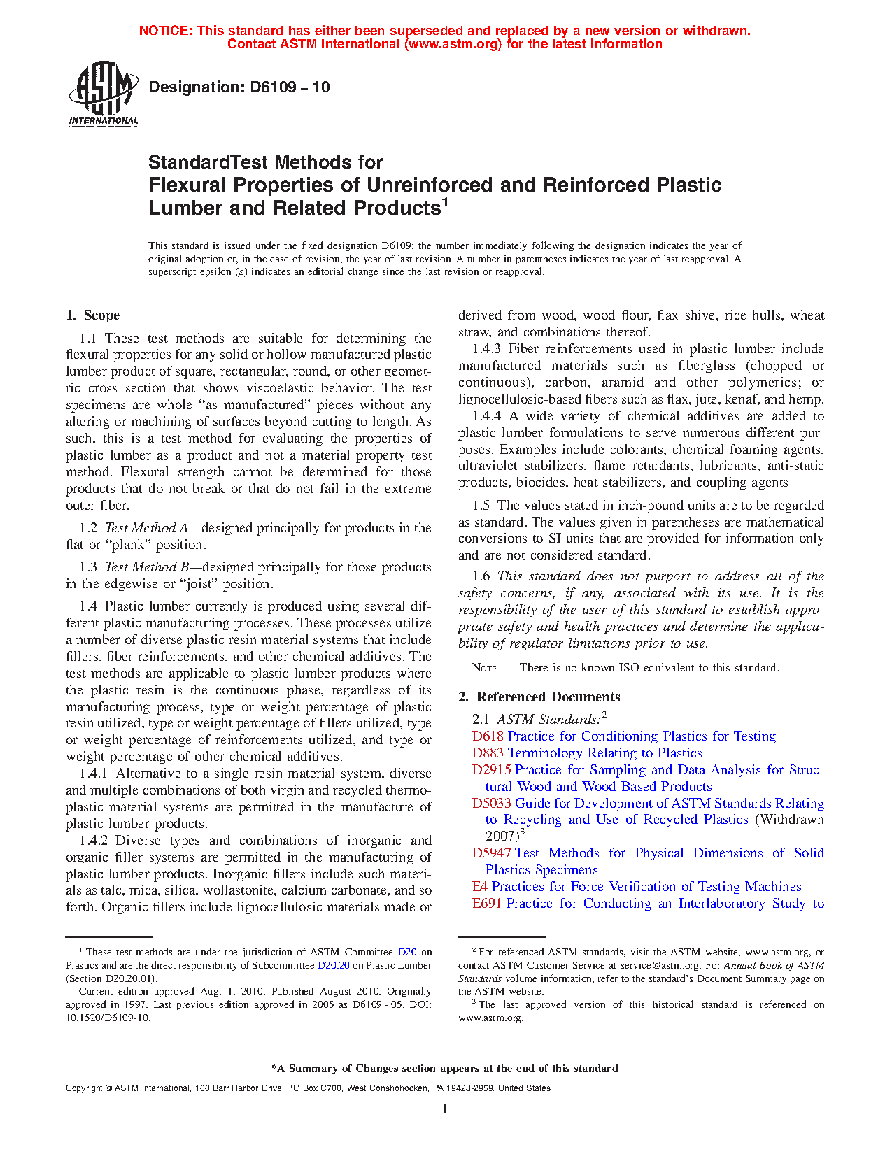 1.4 Plastic lumber currently is produced using several different plastic manufacturing processes. These processes utilize a number of diverse plastic resin material systems that include fillers, fiber reinforcements, and other chemical additives. The test methods are applicable to plastic lumber products where the plastic resin is the continuous phase, regardless of its manufacturing process, type or weight percentage of plastic resin utilized, type or weight percentage of fillers utilized, type or weight percentage of reinforcements utilized, and type or weight percentage of other chemical additives.