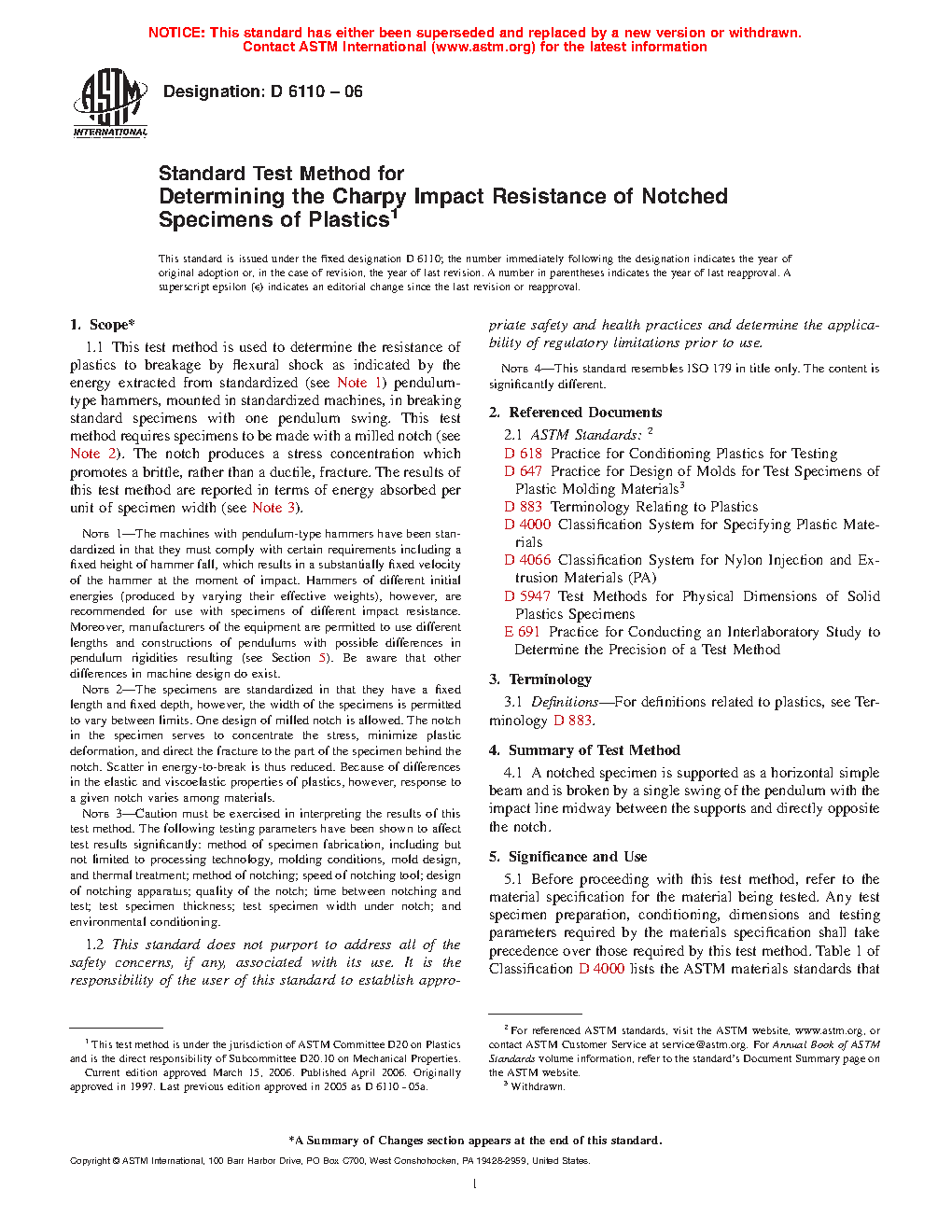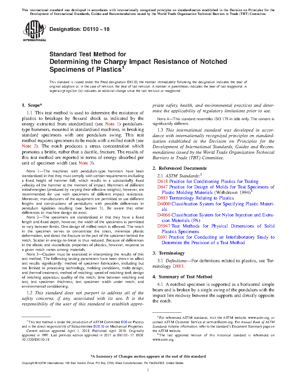 1.1 This test method is used to determine the resistance of plastics to breakage by flexural shock as indicated by the energy extracted from standardized (see Note 1) pendulum-type hammers, mounted in standardized machines, in breaking standard specimens with one pendulum swing. This test method requires specimens to be made with a milled notch (see Note 2). The notch produces a stress concentration which promotes a brittle, rather than a ductile, fracture. The results of this test method are reported in terms of energy absorbed per unit of specimen width (see Note 3).