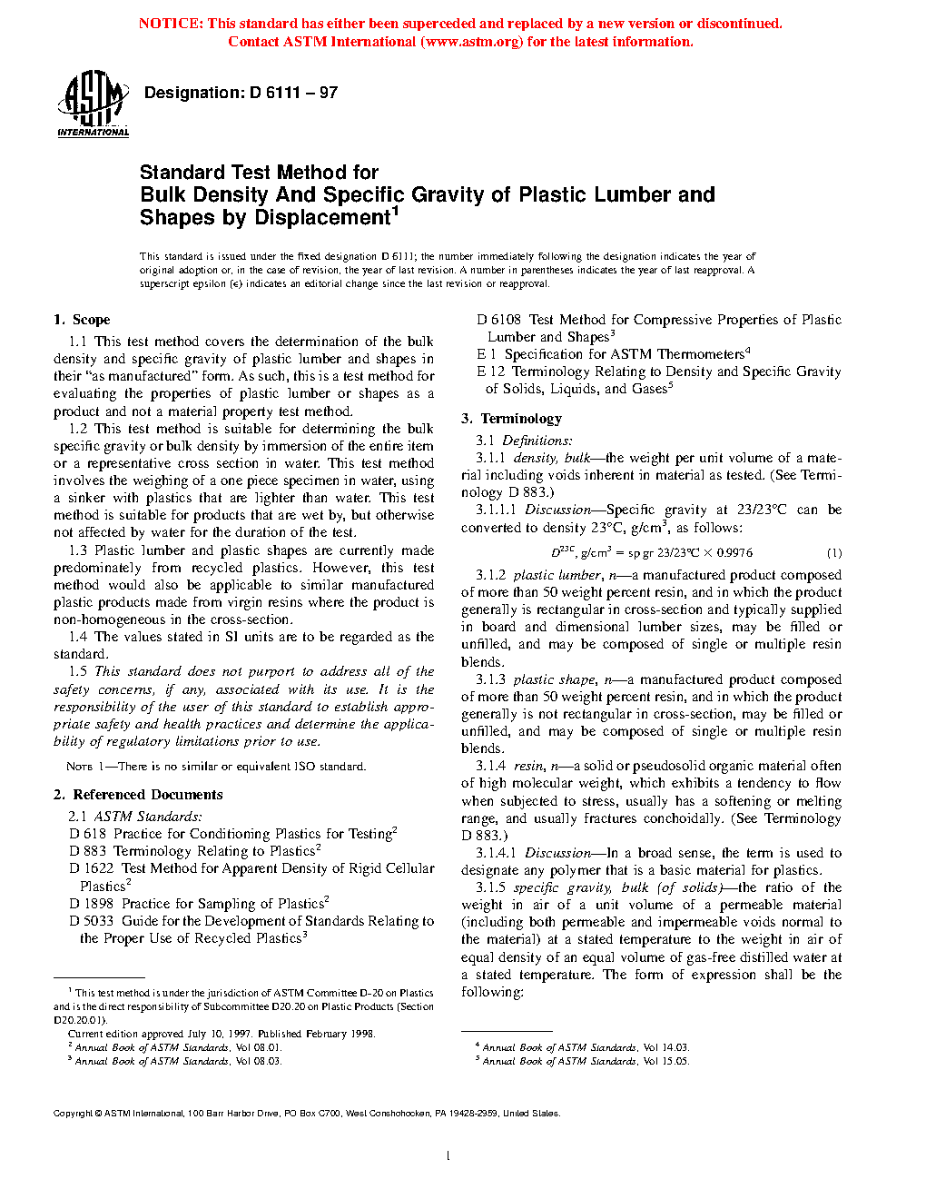 1.1 This test method covers the determination of the bulk density and specific gravity of plastic lumber and shapes in their “as manufactured” form. As such, this is a test method for evaluating the properties of plastic lumber or shapes as a product and not a material property test method.