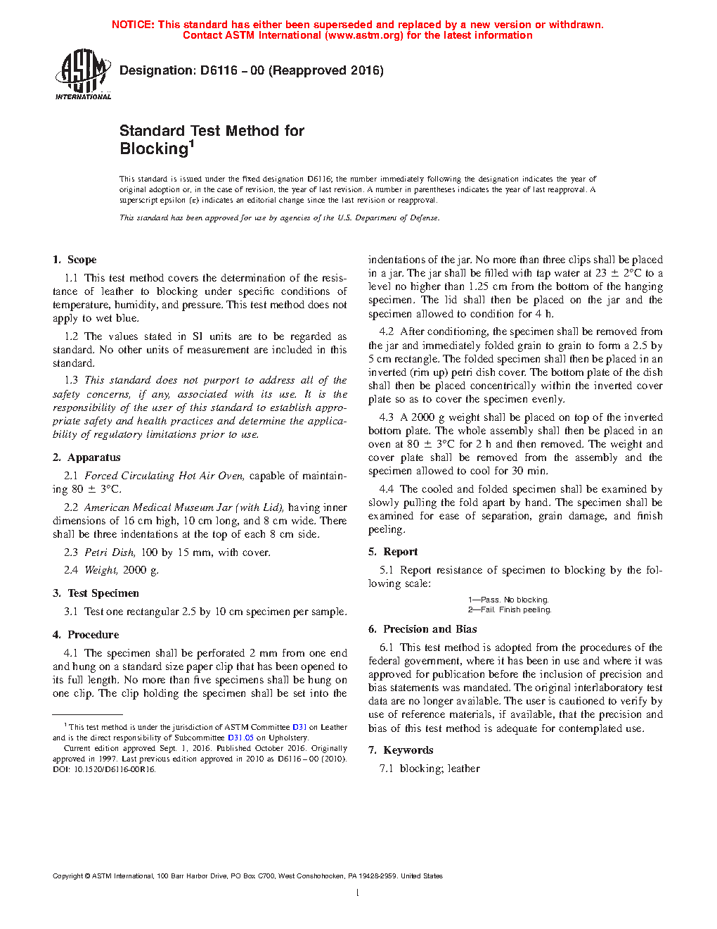 This test method establishes the standard procedure for determining the resistance of leather to blocking under specific conditions of temperature, humidity, and pressure. This method is not applicable to wet blue. This procedure requires the use of a forced circulating hot air oven, American Medical Museum jar with lid, Petri dish with cover, and weights.