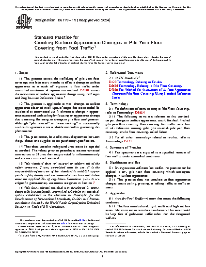 1.2 This practice is applicable to most changes in surface appearance observed in all types of carpet that are intended for residential or commercial use. It eliminates change in appearance associated with soiling by focusing on appearance change due to matting, flattening, or change in pile fiber configuration. Although “pile reversal” or “watermarking” is occasionally visible, this practice is not a reliable method for producing this phenomenon.