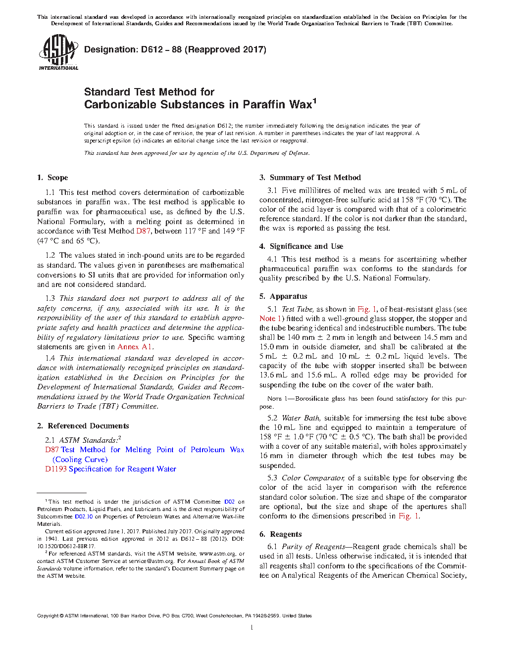 1.1 This test method covers determination of carbonizable substances in paraffin wax. The test method is applicable to paraffin wax for pharmaceutical use, as defined by the United States Pharmacopeia National Formulary (USP-NF), with a melting point as determined in accordance with Test Method D87, between 47 °C and 65 °C (117 °F and 149 °F).