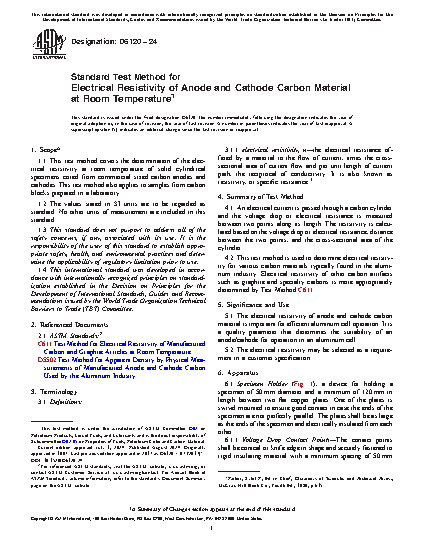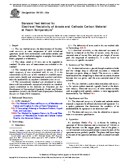 1.1 This test method covers the determination of the electrical resistivity at room temperature of solid cylindrical specimens cored from commercial sized carbon anodes and cathodes. This test method also applies to samples from carbon blocks prepared in a laboratory.
